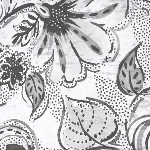 A striking fun floral print with watercolor marks and dots in shades of grey and black. Designed by Susan Werner.