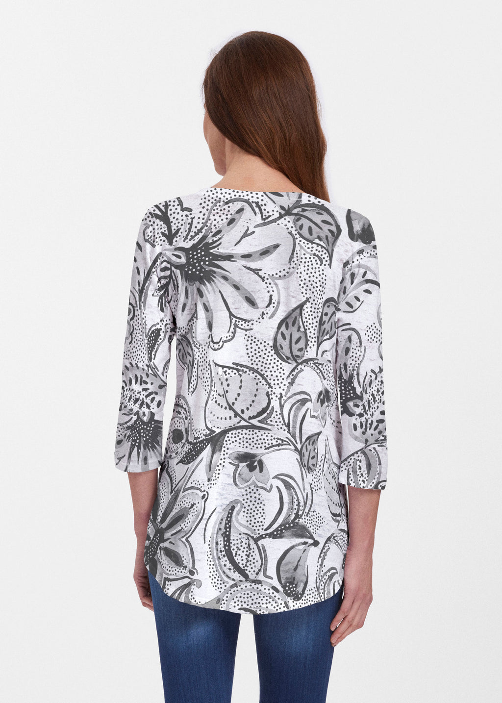 This v-neck tunic in our Signature burnout fabric is forever flattering. 3/4 sleeves and a v-neck flow into a full, swinging shirttail hem.