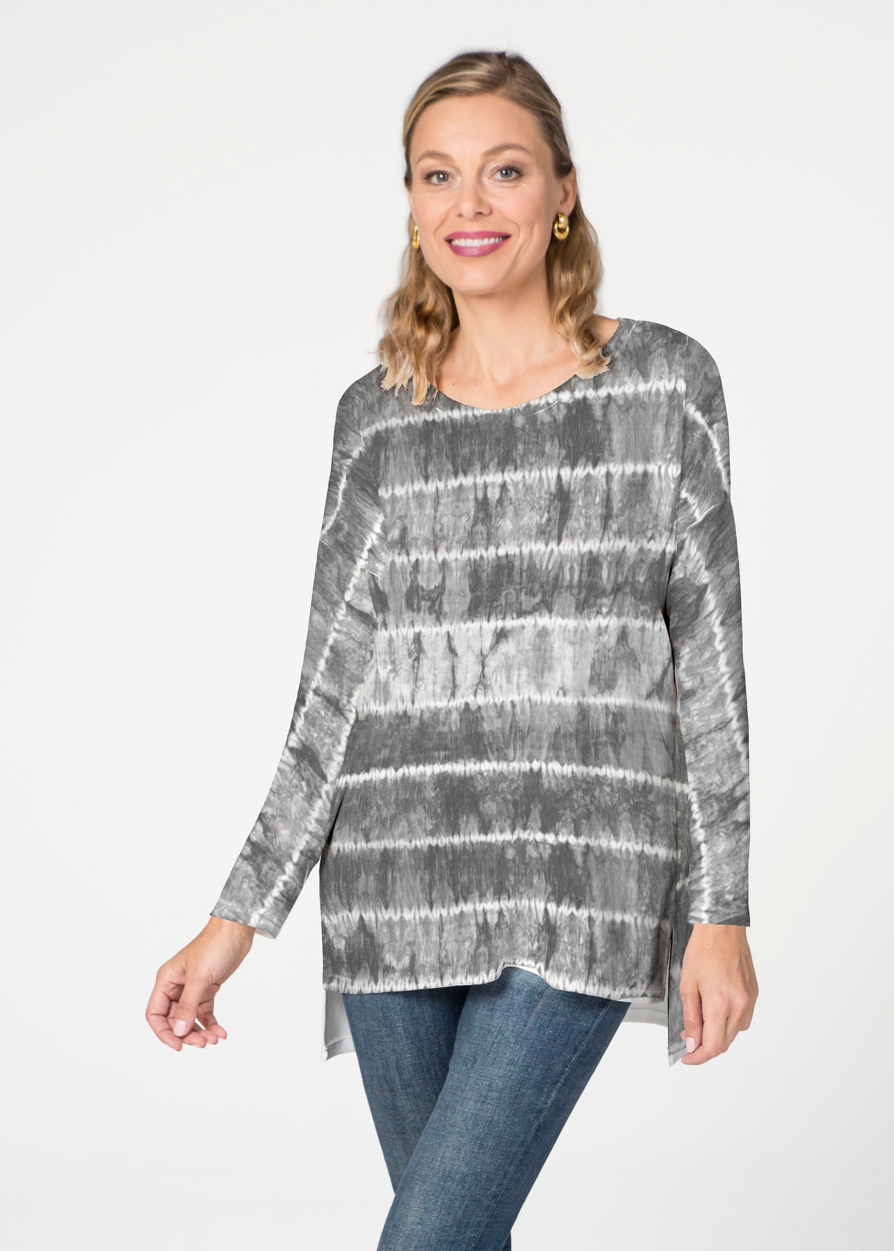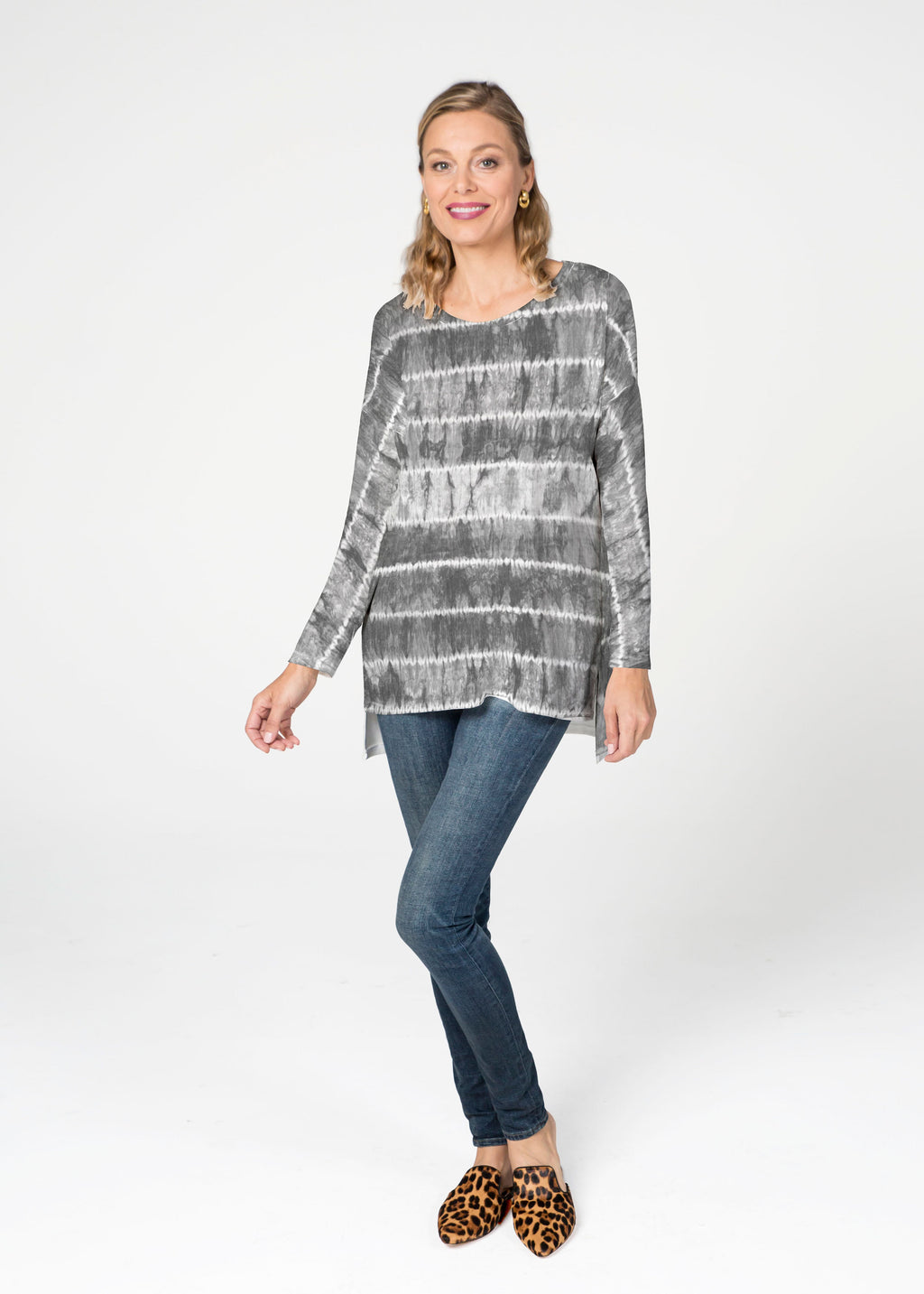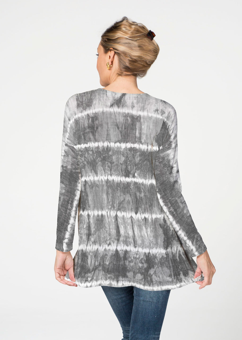 This striped tie dye print in so in trend right now with shades of black and white designed by Debra Valencia..