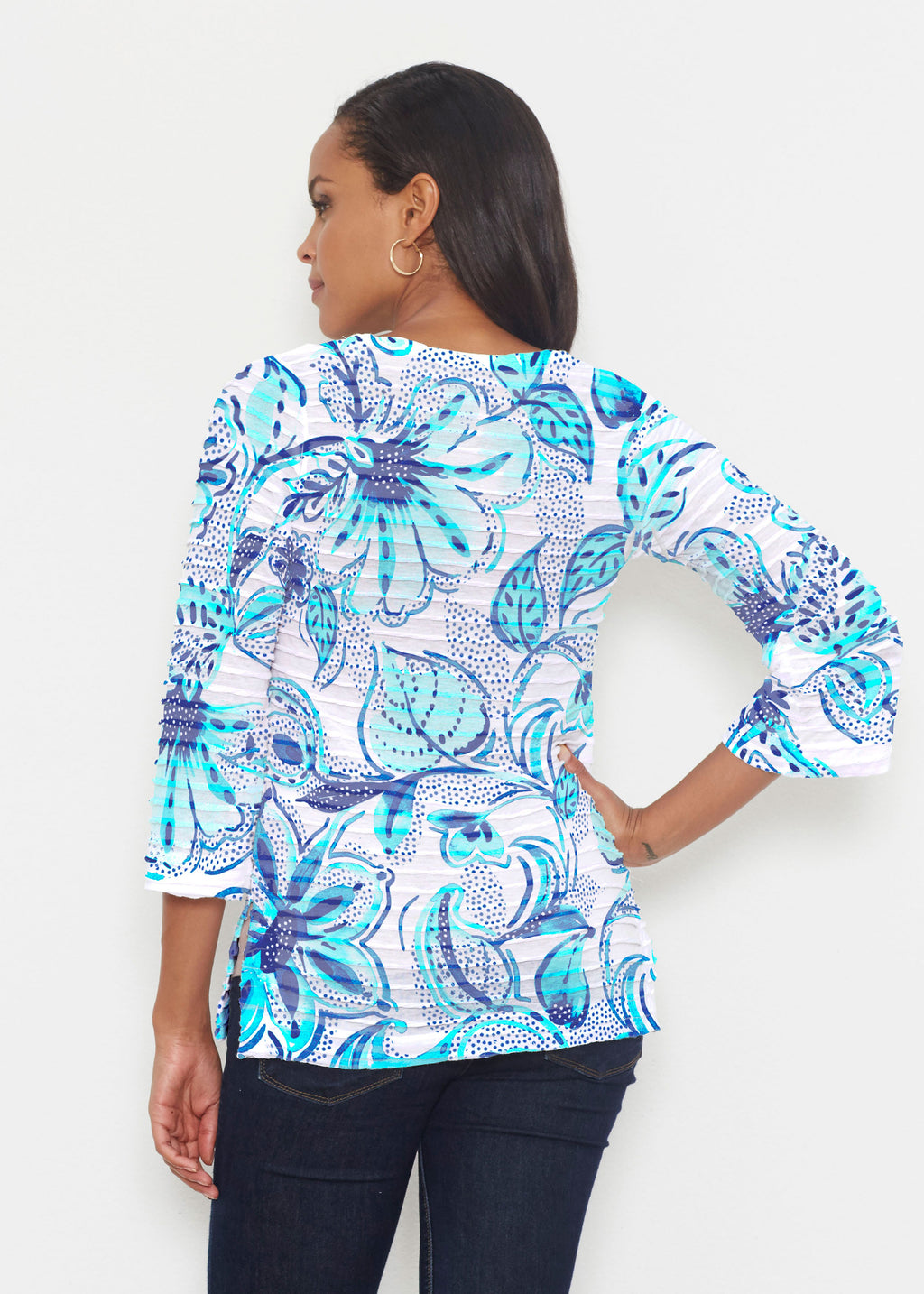 The uniquely soft, pleated texture in this Banded fabric give the 3/4 bell sleeves and sweetheart v-neck a fun and sophisticated look. Flattering side vents adorn the hemline that skims the hip.