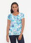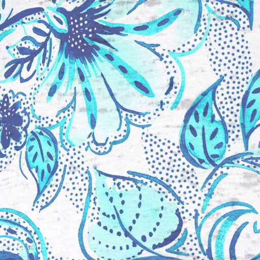 A striking fun floral print with watercolor marks and dots in shades of blue and aqua. Designed by Susan Werner.
