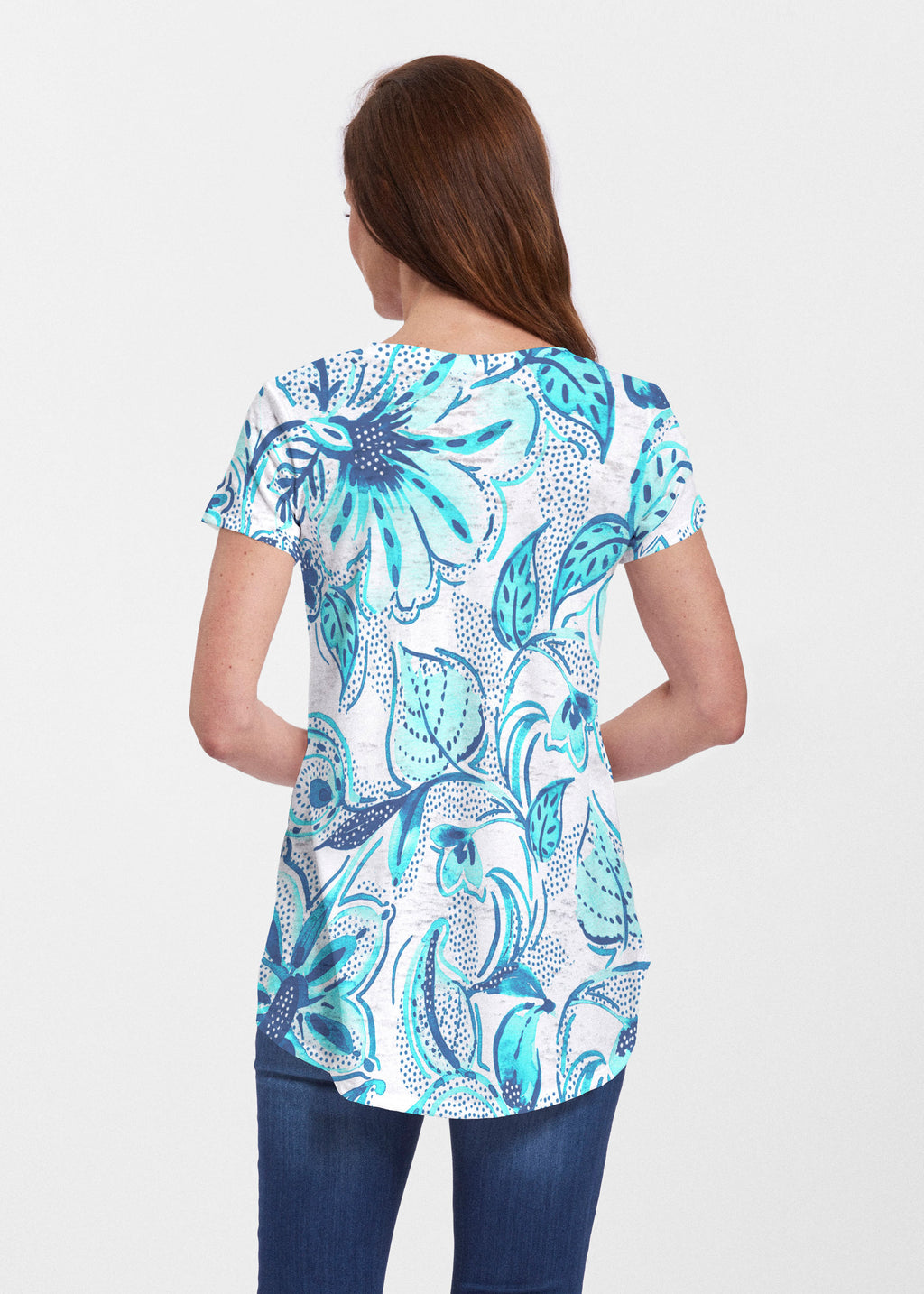 An effortlessly flattering tunic in our soft Signature burnout fabric featuring short sleeves and a scoop neck with a body that flows into a full, swinging shirttail hem.