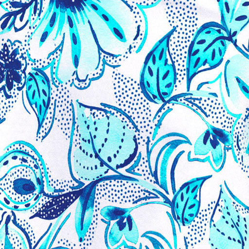 A striking fun floral print with watercolor marks and dots in shades of blue and aqua. Designed by Susan Werner.