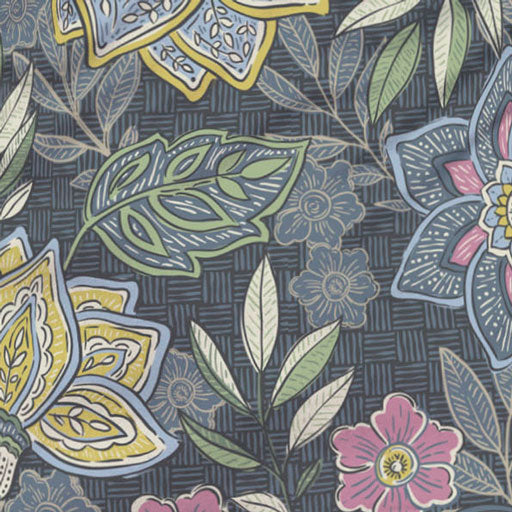 Embroidery inspired print with yellow and rose ornamental flowers on a black background with subtle crosshatch pattern designed by Diane Kappa.