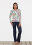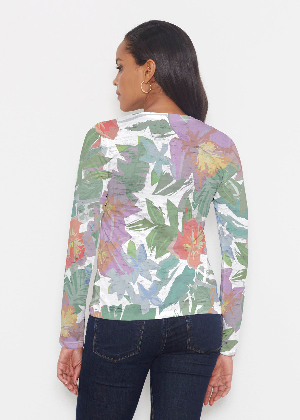 Is a stunning hand-painted print design that showcases large hibiscus and orchid flowers created with bold brushstrokes. This artistic interpretation captures the beauty and elegance of tropical blooms in vibrant shades of reds, purples, and blues.