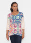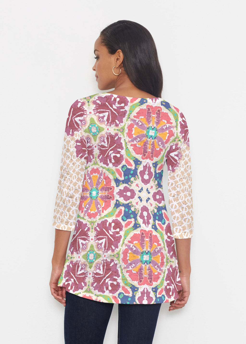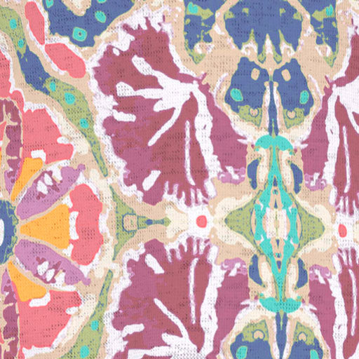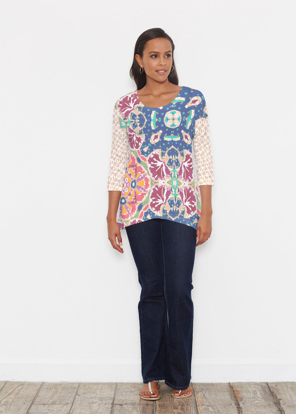 Pretty palette play of blue, orange, pink, burgundy and beige with contrasting sleeve designed by JoAnn Lieberman.
