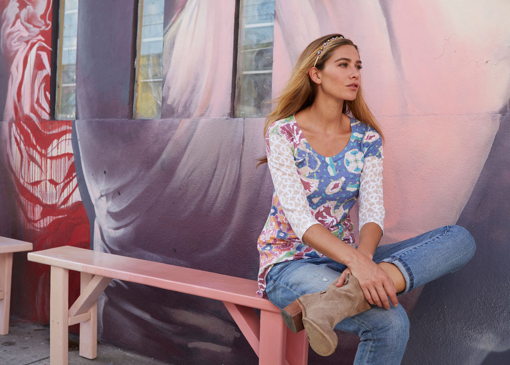 An elegant fit, the hemline falls higher in front then cascades beautifully down across back. Delicate scoop neckline and 3/4 sleeves made in our soft Baby Waffle burnout thermal blend.