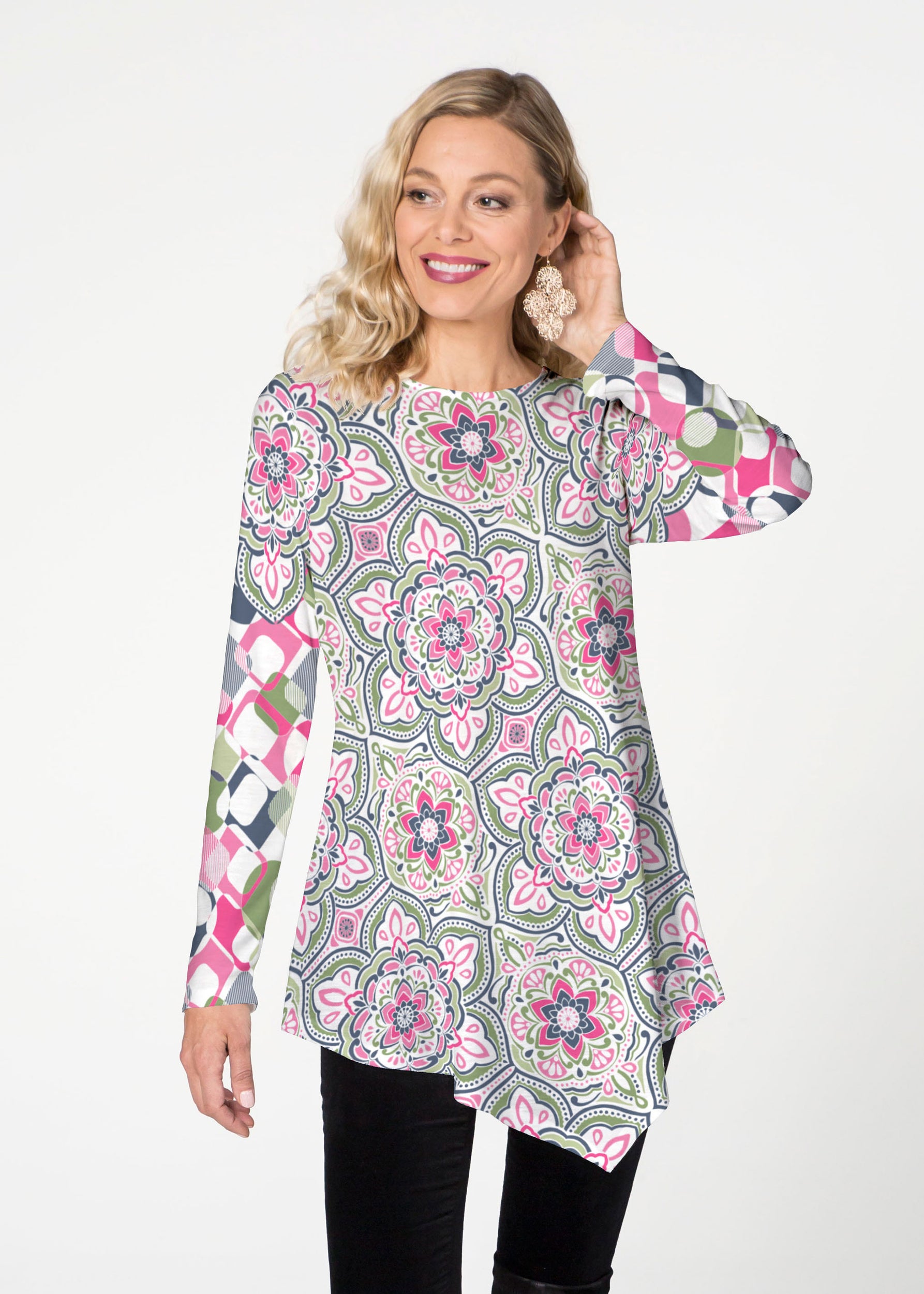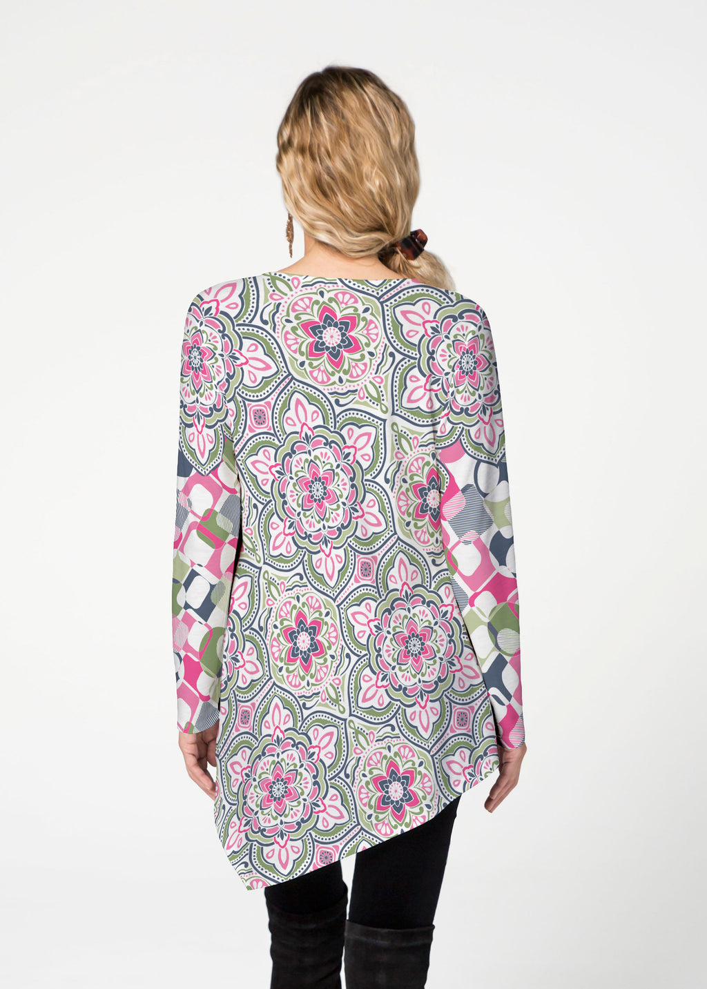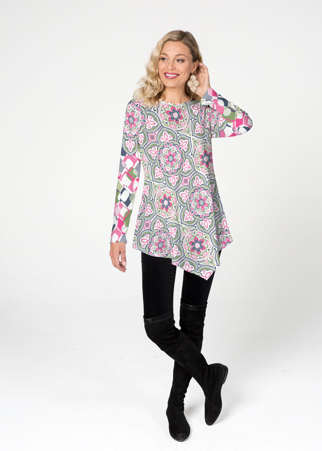 The Asymmetrical French Terry Tunic is soft and lightweight. This Relaxed crew neck features an Asymmetrical hem that falls just below the hip with long sleeves.