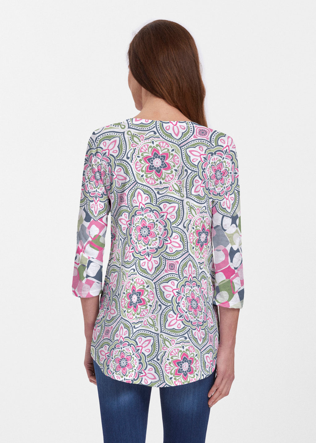 This v-neck tunic in our Signature burnout fabric is forever flattering. 3/4 sleeves and a v-neck flow into a full, swinging shirttail hem.