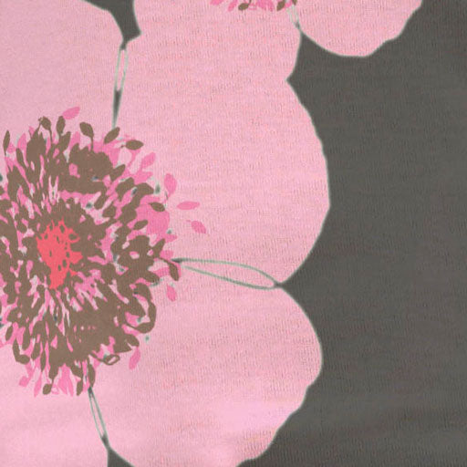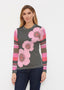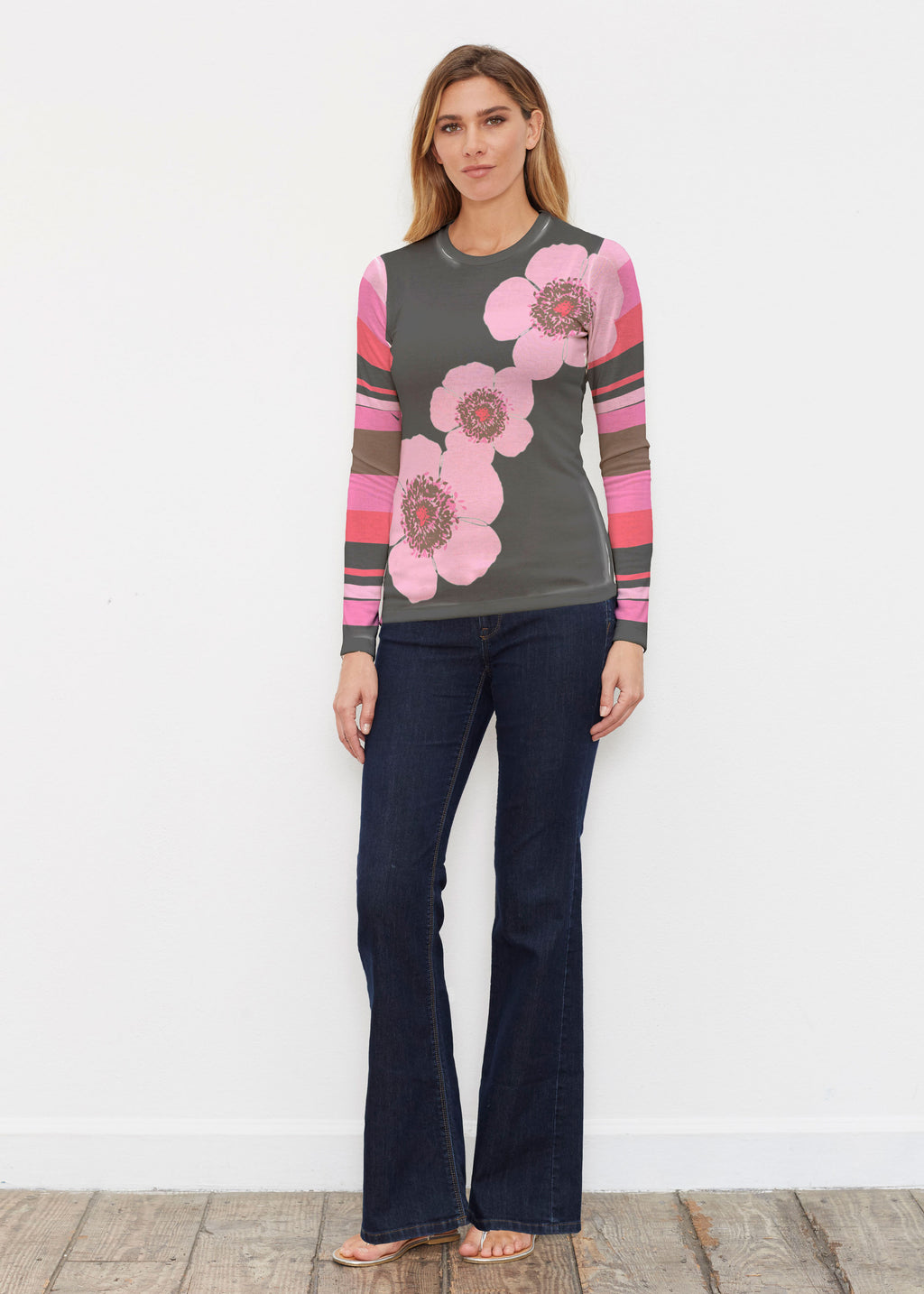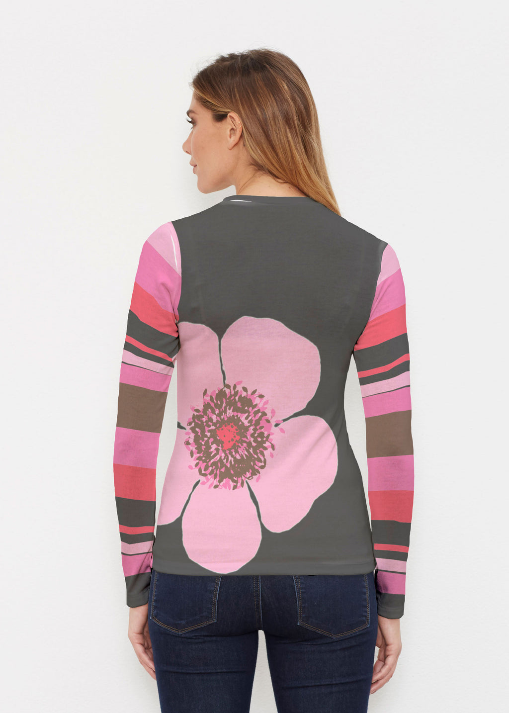 This print features small poppies on the front with a large poppy on back with striped sleeves in black and pink. This classic favorite designed by Susan Werner.