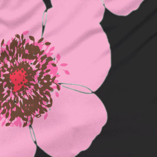 This print features small poppies on the front with a large poppy on back with striped sleeves in black and pink. This classic favorite designed by Susan Werner.