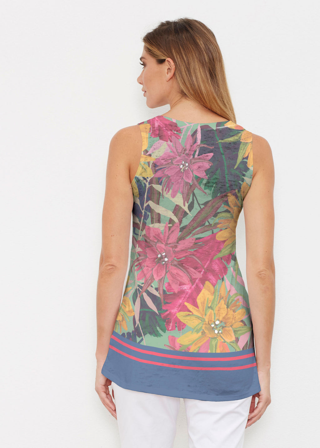 This tank is the perfect combination of an elegant shape with a sporty look. A high-low cascading hemline falls loosely over the hip in our Signature burnout fabric. No sleeves and a shallow scoop neckline give this tank its sporty vibe. -- Your one-of-a-kind garment is created using all-over soft garment sublimation printing. Selected designs are individually printed into your garment. Cotton/Polyester blend.