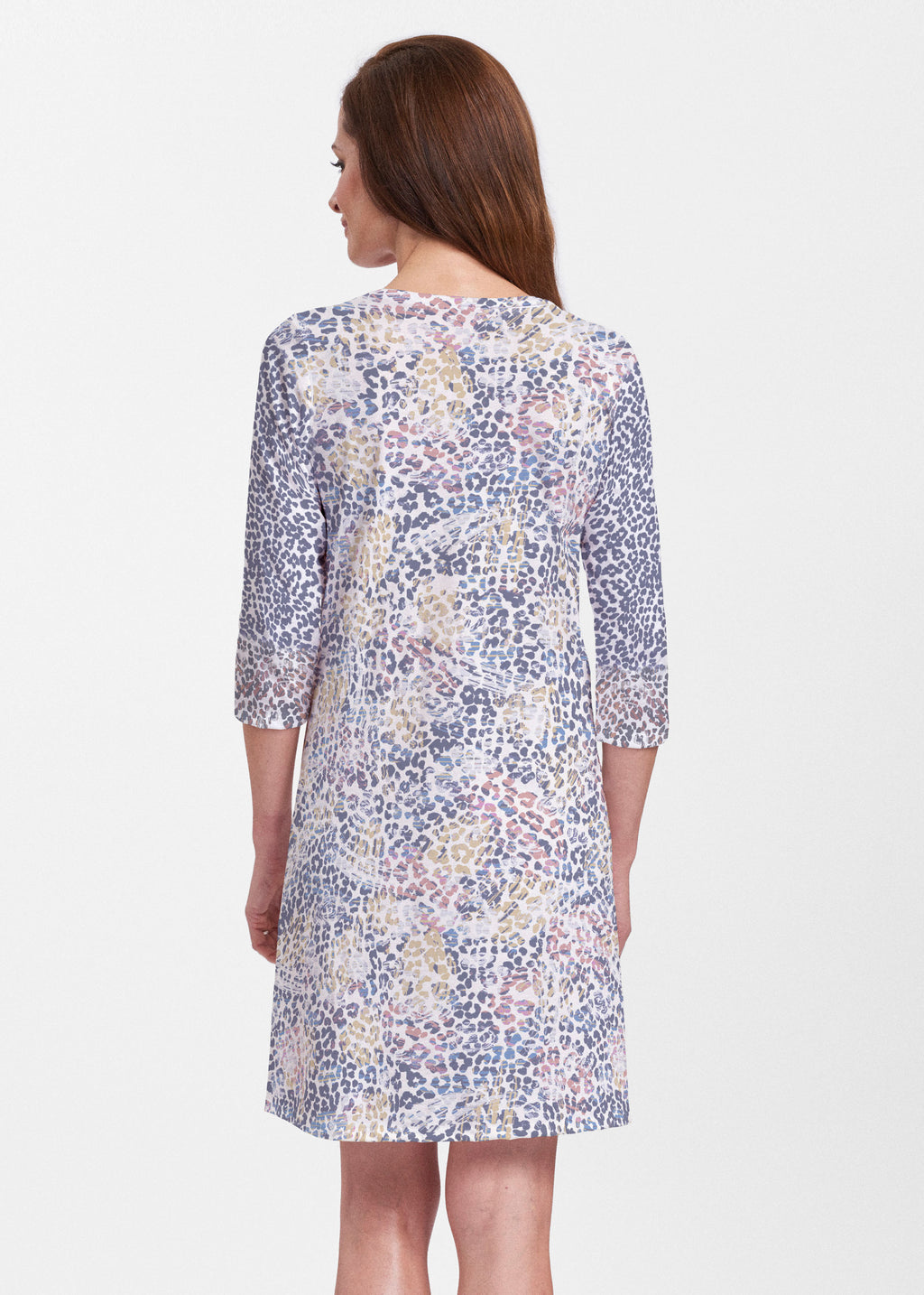 A relaxed swing silhouette with 3/4 sleeves and v-neck make up the newest addition to our Classic dress collection. Hem falls just above the knee.