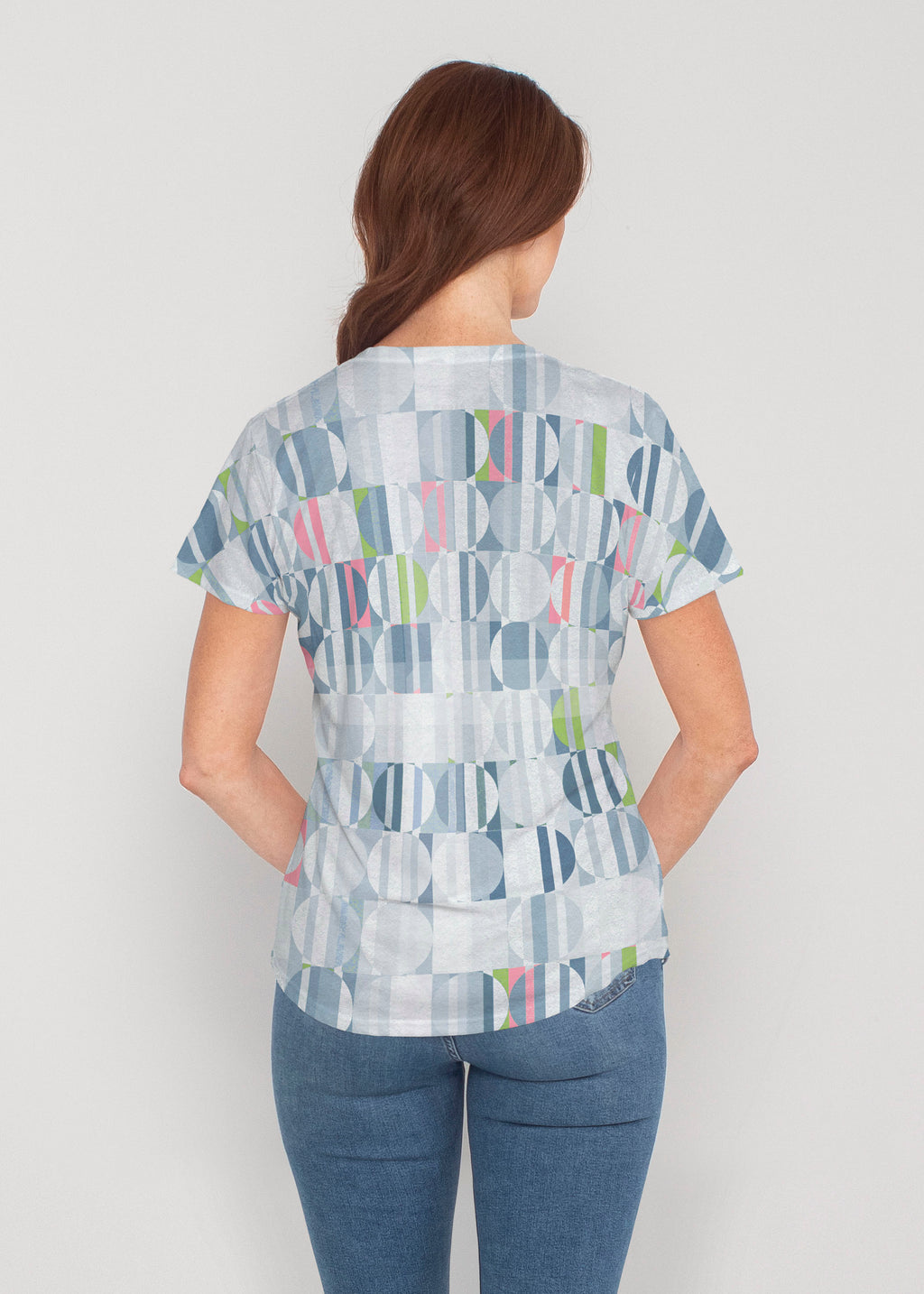 Beautiful striped geometric circles in lime, pinks and greys by Susan Werner