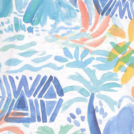 Dreaming of a tropical island with this print of blues, aquas, peaches & yellow/oranges with palm trees and waves of aqua.