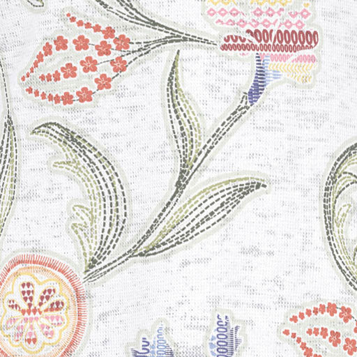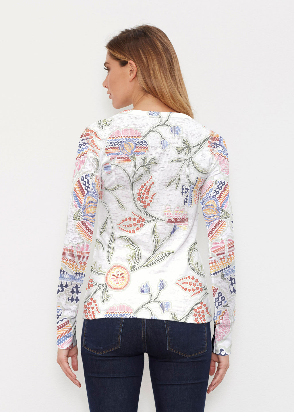 A playful print of stitched floral patterns on a white background and bold mixed sleeves. Designed by Susan Werner.