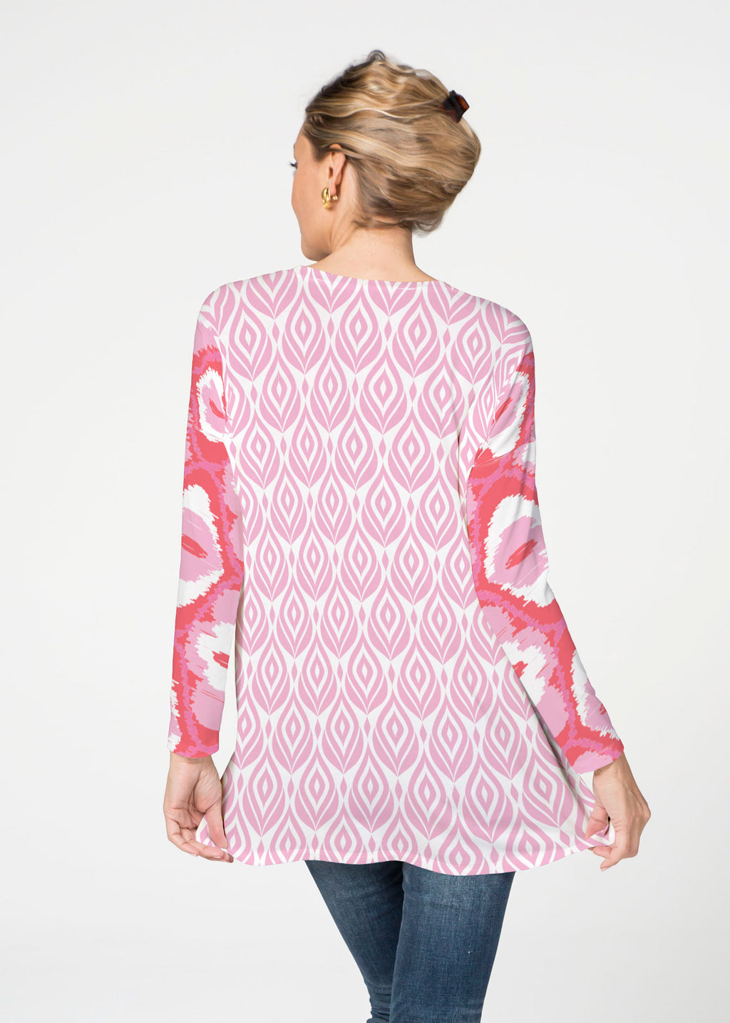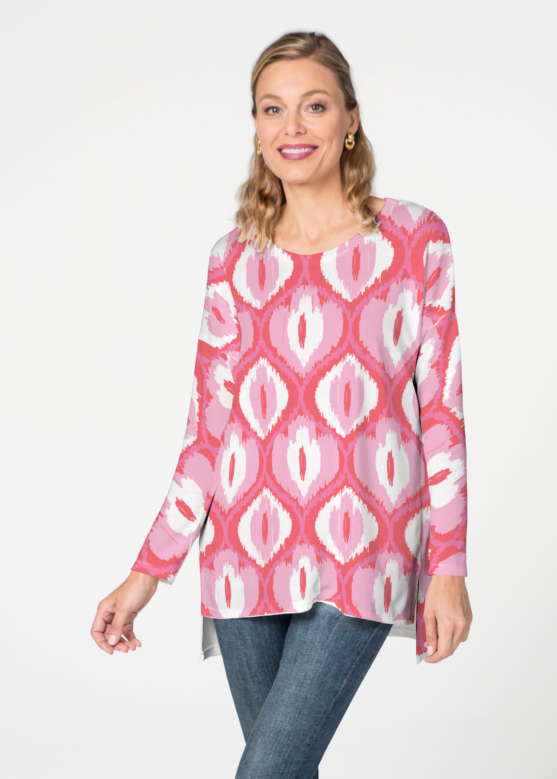 A playful ikat print in shades of pink & red with a back panel of our "bud" print in pink and white.
