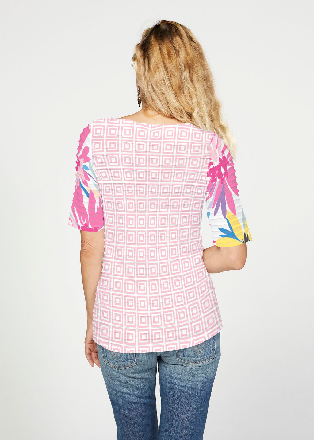 The uniquely soft, pleated texture in this Banded fabric gives the elbow sleeve and boat neck top a fun and sophisticated look. Easy relaxed fit with a hemline that comes below the hip.