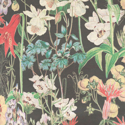 This painterly floral print incorporates a splendid array of multi-colored prairie flowers, glowingly offset against a midnight black canvas - Designed by Susan Werner
