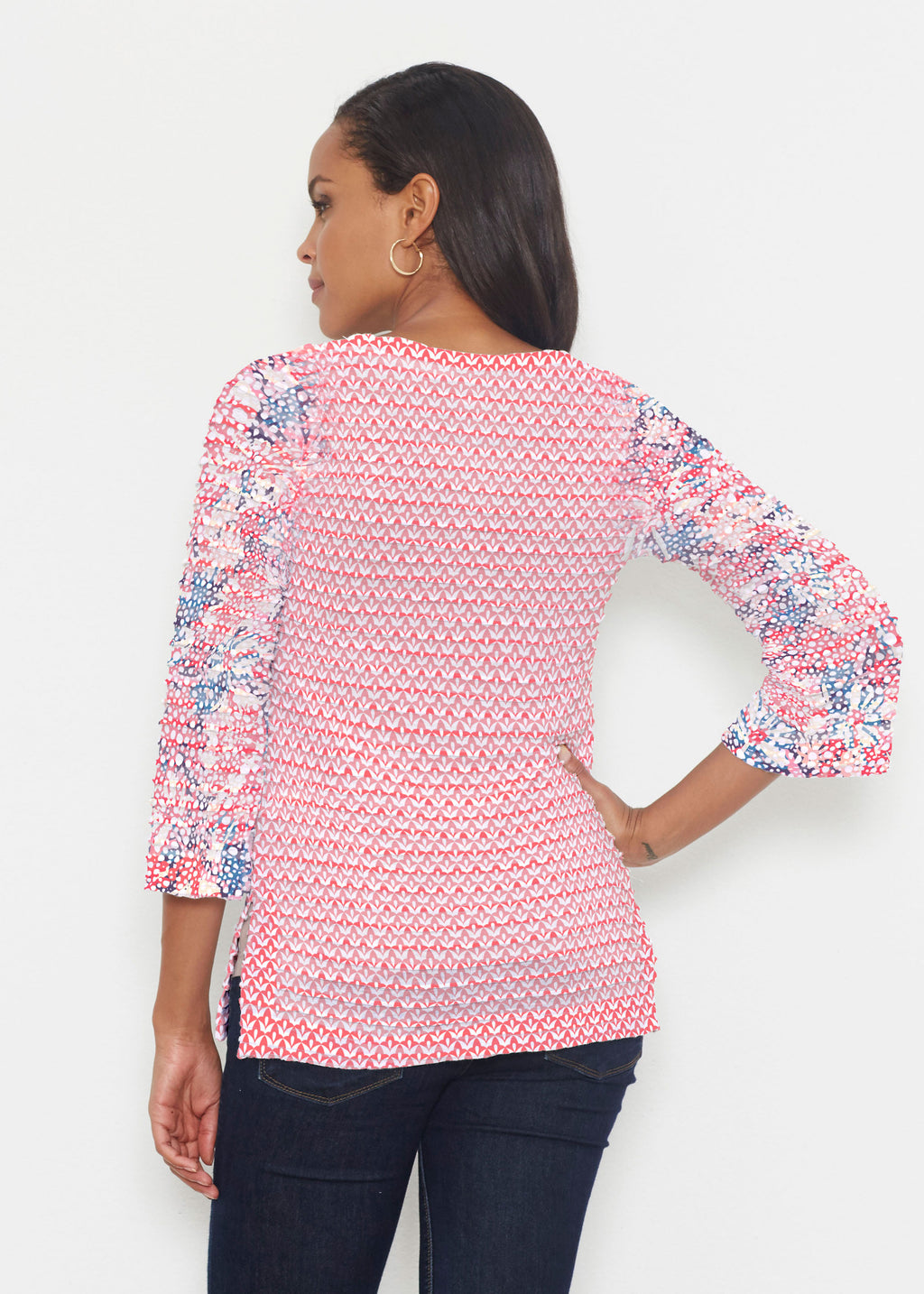 The uniquely soft, pleated texture in this Banded fabric give the 3/4 bell sleeves and sweetheart v-neck a fun and sophisticated look. Flattering side vents adorn the hemline that skims the hip.