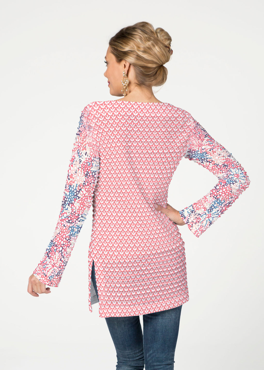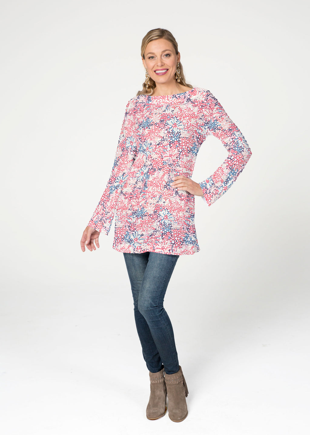 The Banded Boatneck Tunic has the soft pleated texture of our Banded fabric, making this a sophisticated, casual year round piece. A forgiving fit, side vents, with a relaxed full length sleeve combine for a flattering look. The hemline flows gently over the hip.