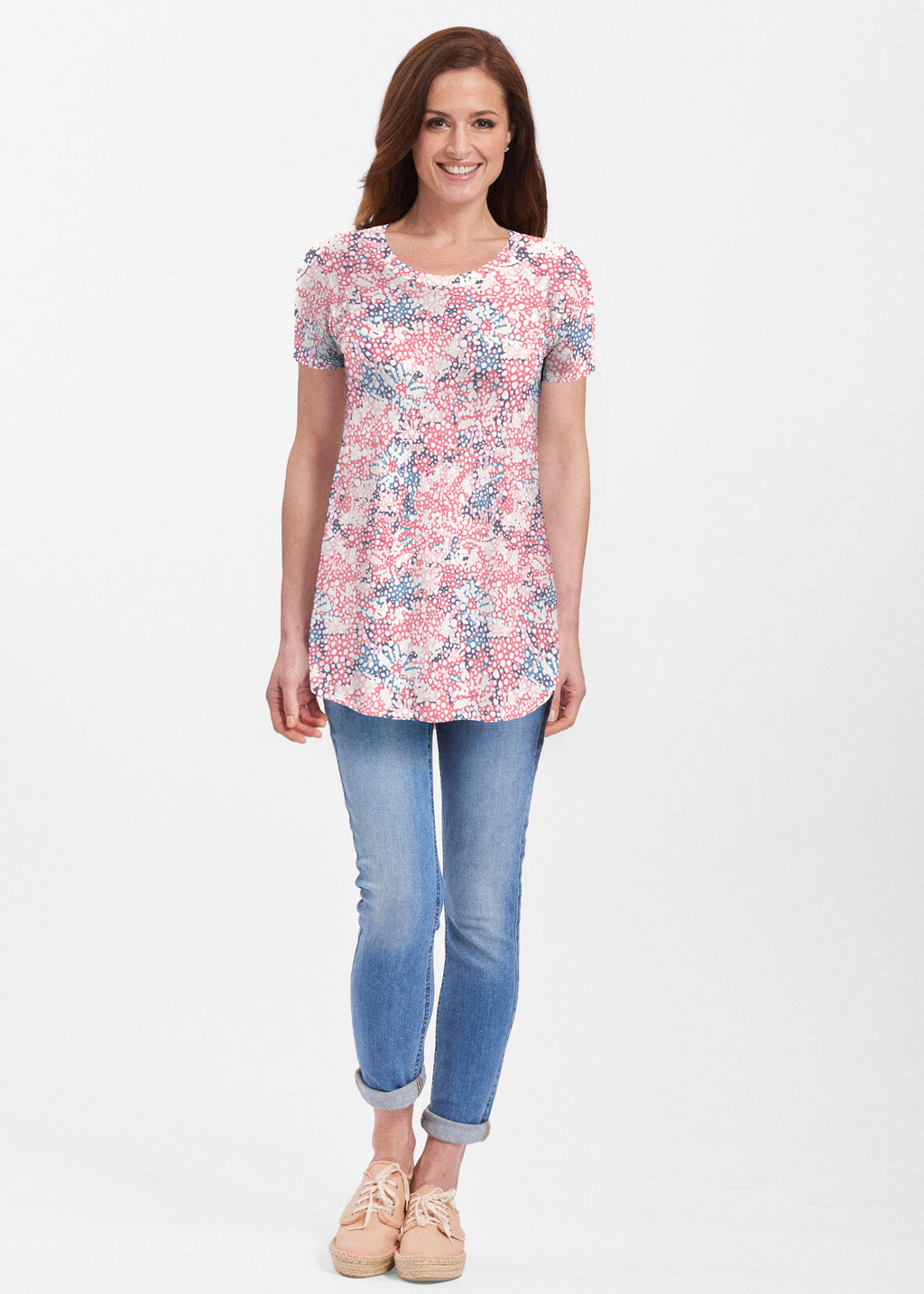 Our soft and feminine short sleeve silhouette tunic is sure to flatter any figure. Made in our Butterknit fabic that flows into a relaxed curved hem that is slightly longer in the back with subtle side slits.