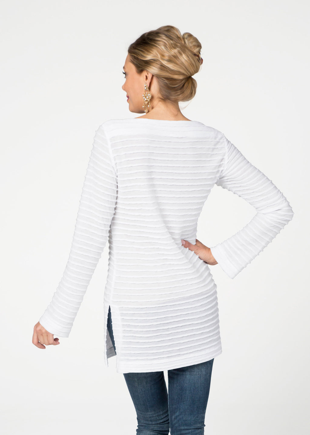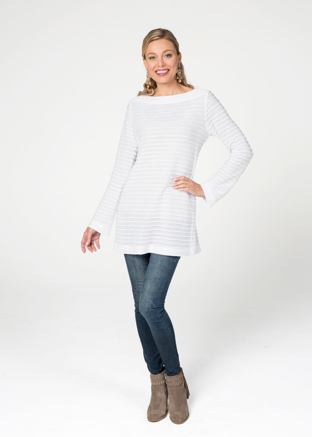 The Banded Boatneck Tunic has the soft pleated texture of our Banded fabric, making this a sophisticated, casual year round piece. A forgiving fit, side vents, with a relaxed full length sleeve combine for a flattering look. The hemline flows gently over the hip.