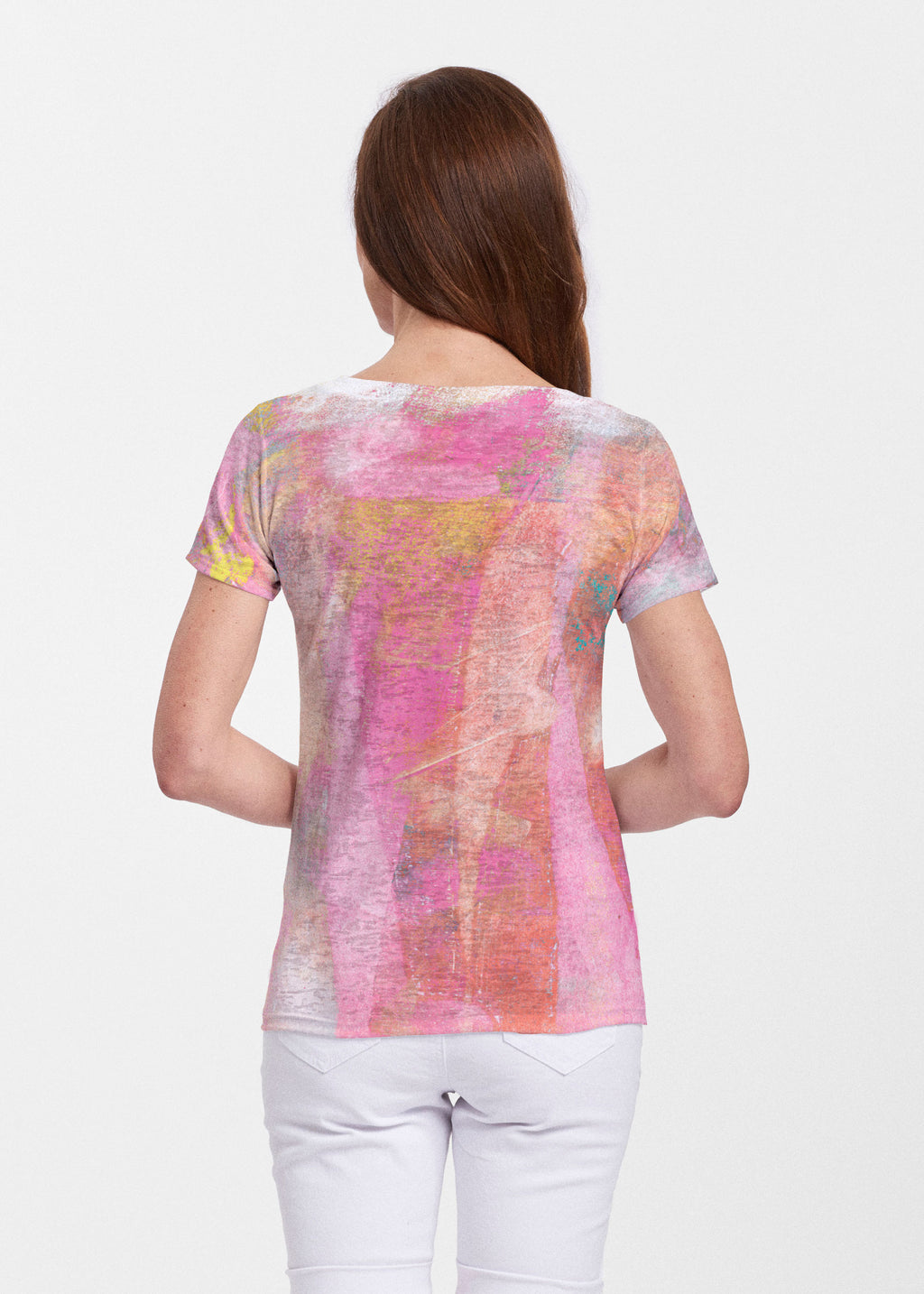 Pink abstract watercolor print with pops of yellow and turquoise designed by LuAnne Roberto.