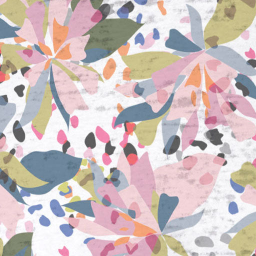 A bold burst of abstract florals and leopard spots in vibrant shades of purple, pink, blue, orange and green with more loosely patterned mixed sleeves. Designed by Susan Werner.