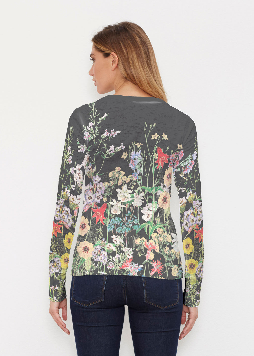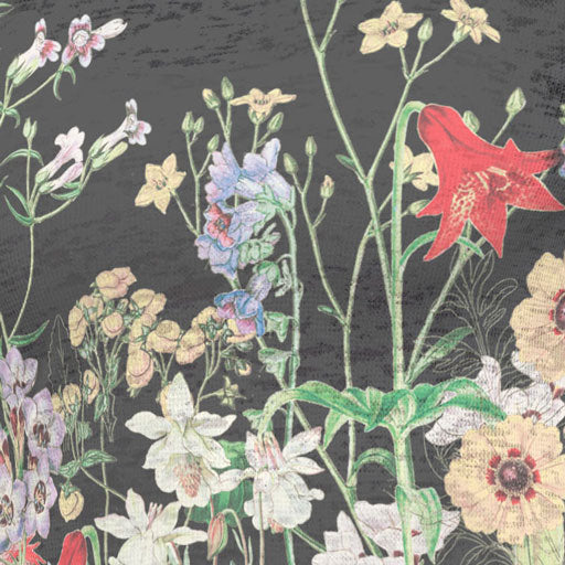 This painterly floral print incorporates a splendid array of multi-colored prairie flowers, glowingly offset against a midnight black canvas - Designed by Susan Werner