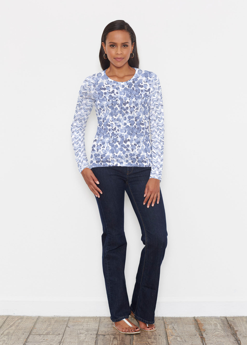 A fun print of mottled dots with chevron inspired mixed sleeves in a beautiful spectrum of blues designed by Susan Werner.