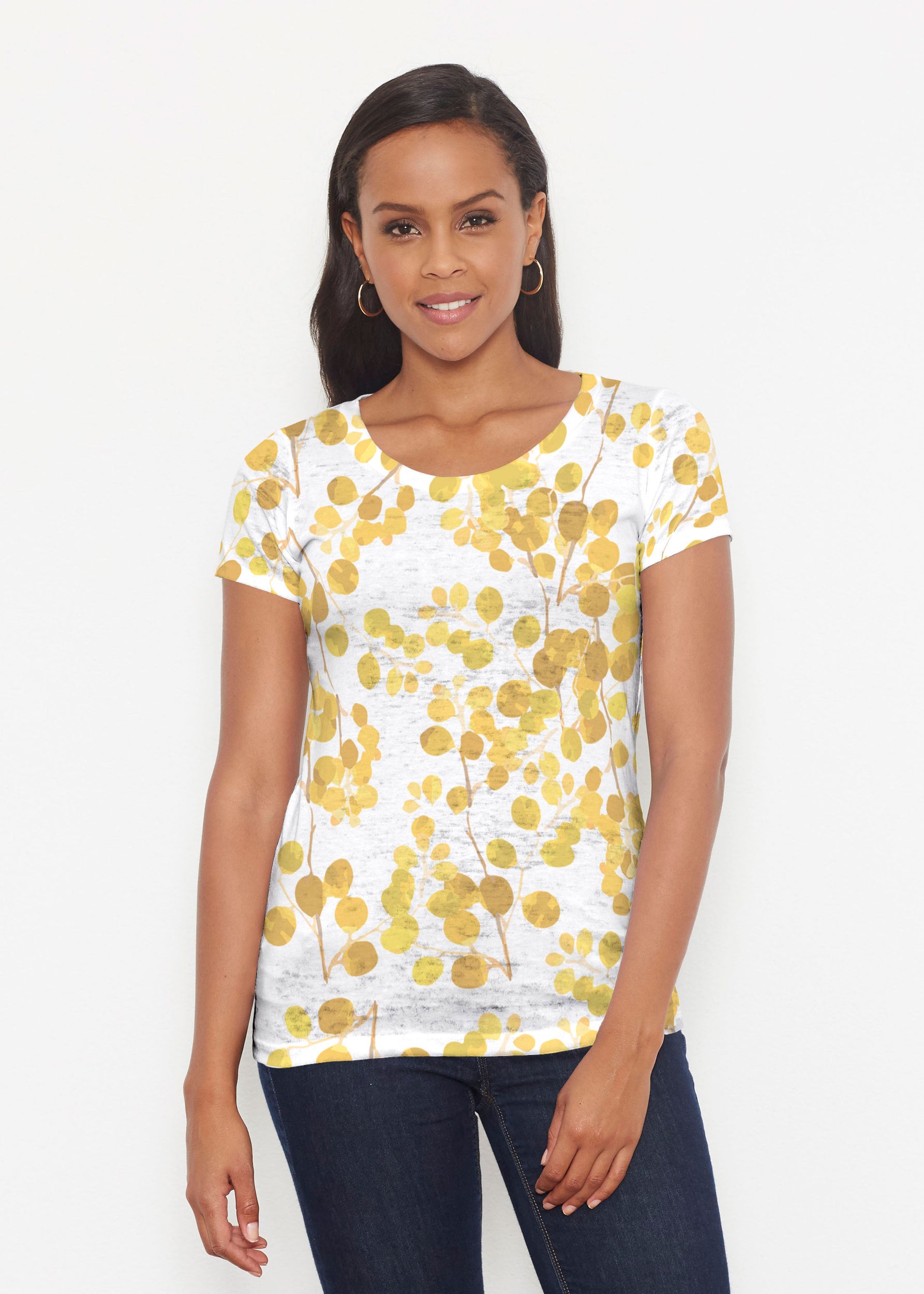 A stunning print of fruitful berries in trending golden yellows, designed by Susan Werner.