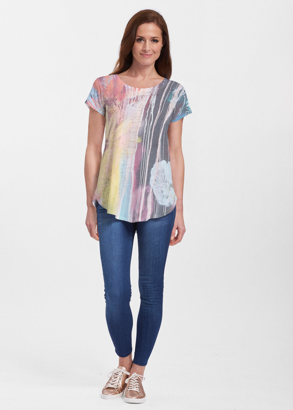 An effortlessly flattering tunic in our soft Signature burnout fabric featuring short sleeves and a scoop neck with a body that flows into a full, swinging shirttail hem.