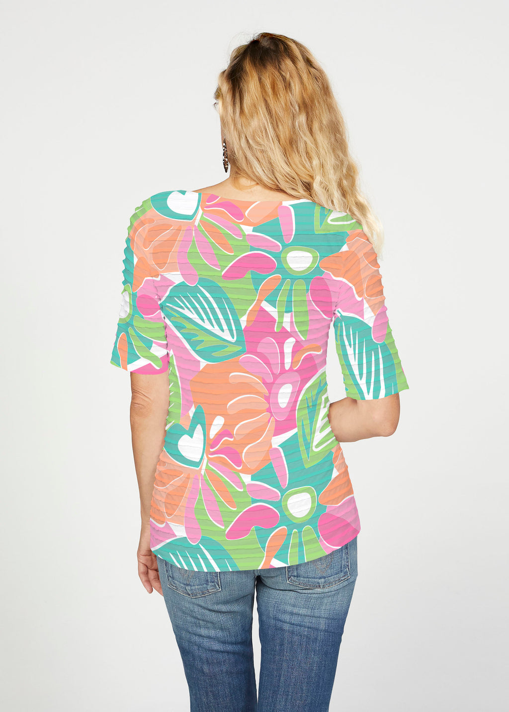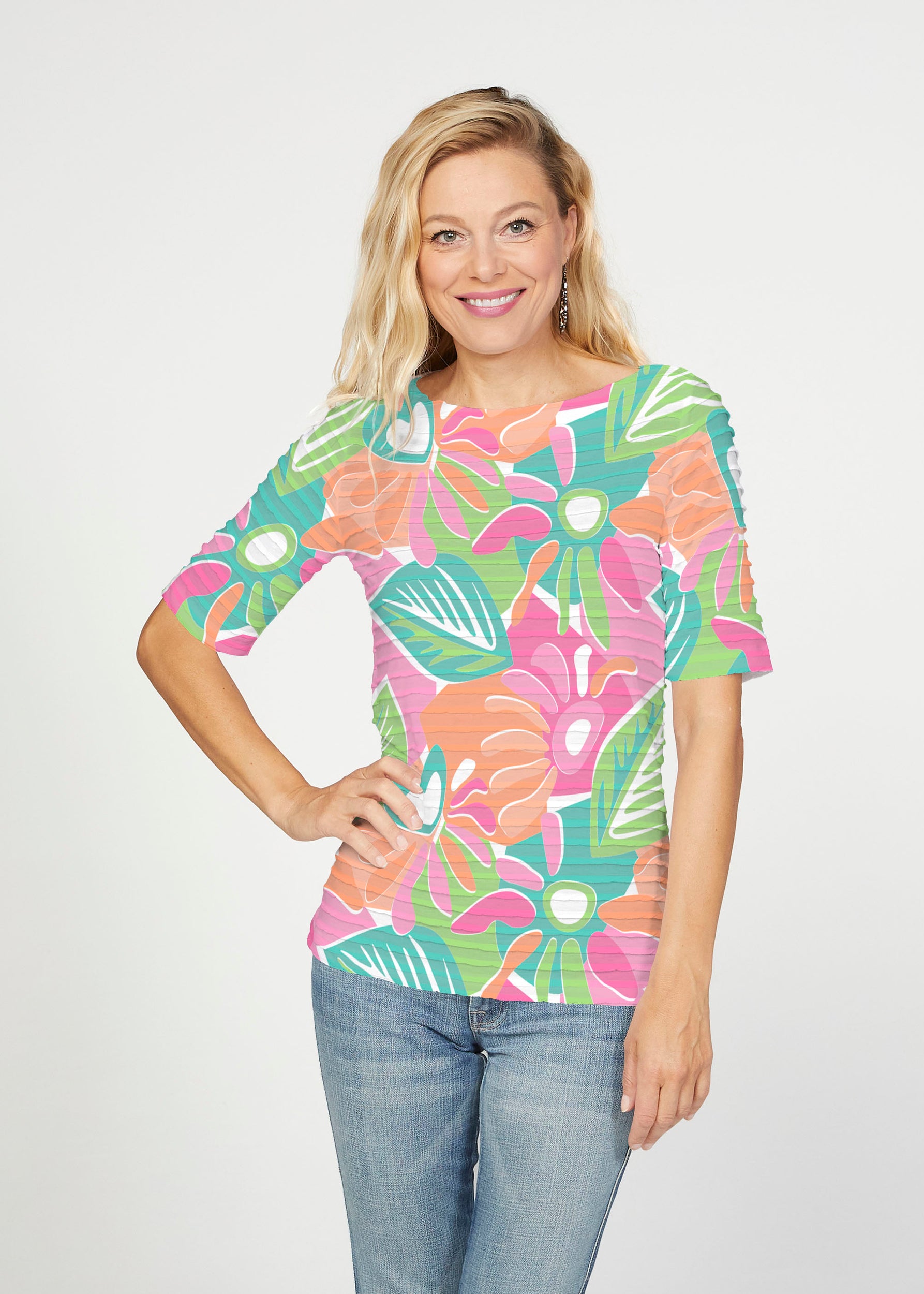 The uniquely soft, pleated texture in this Banded fabric gives the elbow sleeve and boat neck top a fun and sophisticated look. Easy relaxed fit with a hemline that comes below the hip.