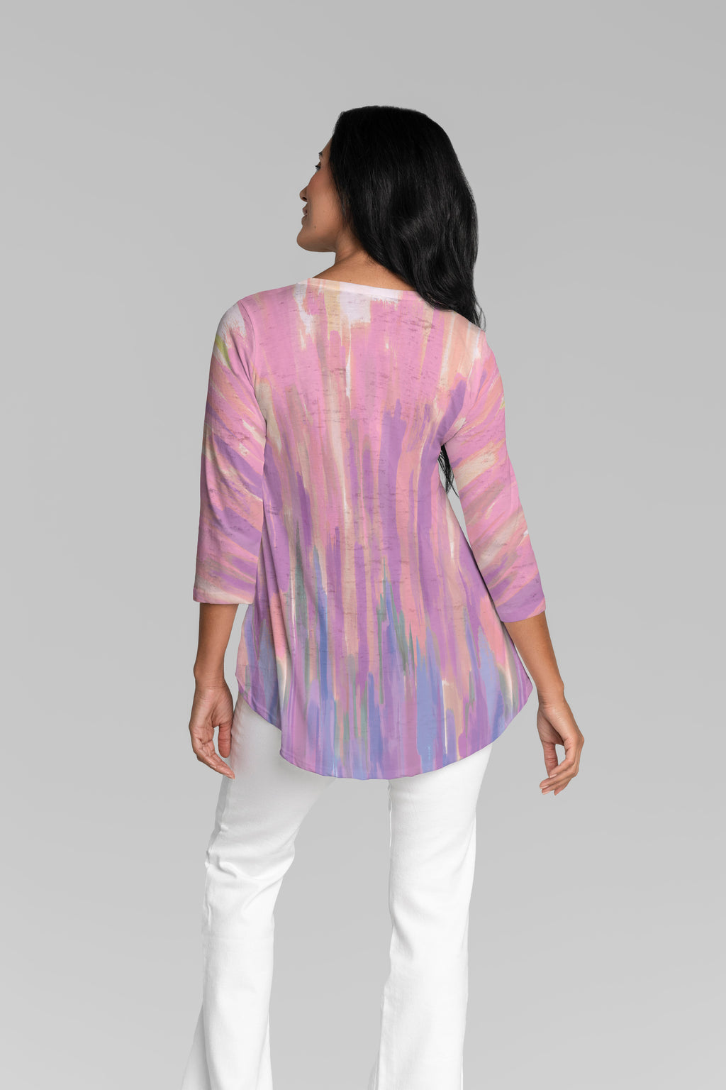 This v-neck tunic in our Signature burnout fabric is forever flattering. 3/4 sleeves and a v-neck flow into a full, swinging shirttail hem.