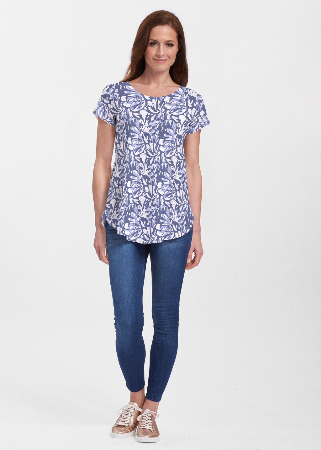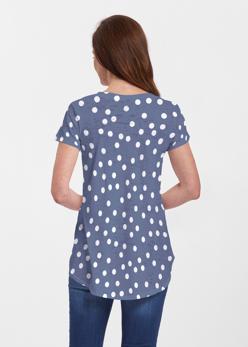 An effortlessly flattering tunic in our soft Signature burnout fabric featuring short sleeves and a scoop neck with a body that flows into a full, swinging shirttail hem.