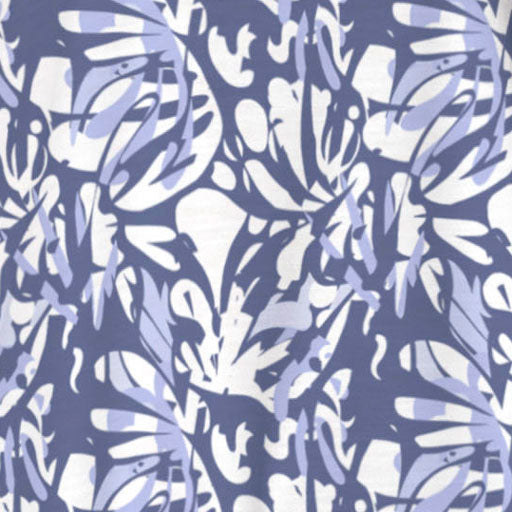 Camouflage pattern derived from interesting abstract shapes overlapping in shades of blues and white with a added pop of dots on the back. Designed by Susan Werner.