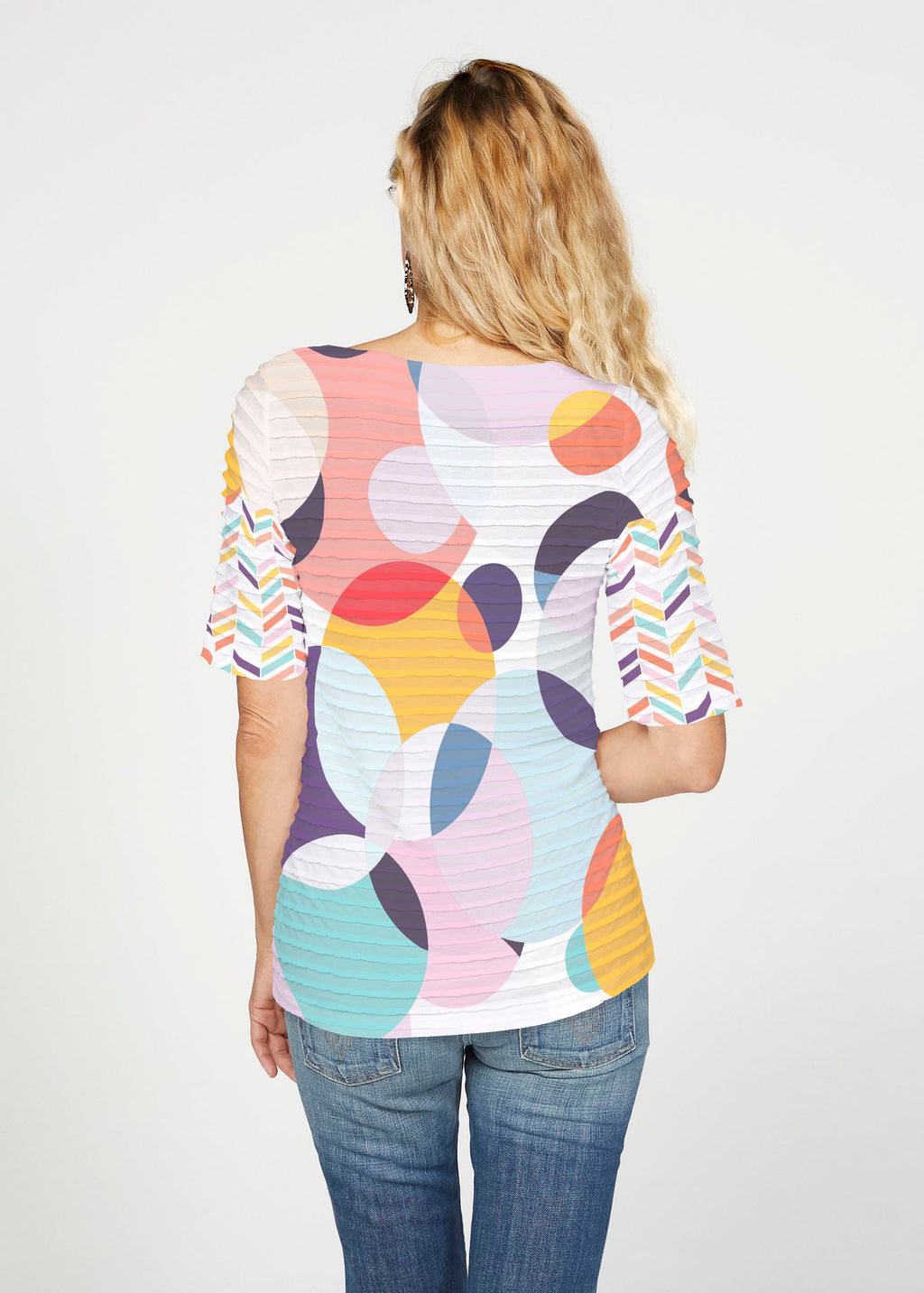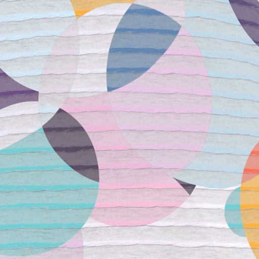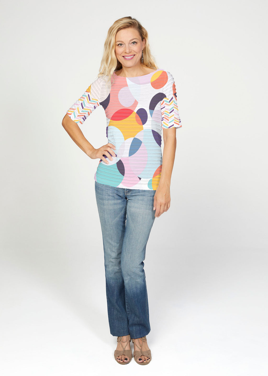 A fun and playful print with bright circles accented with a chevron striped sleeve, designed by Natalie Neto.