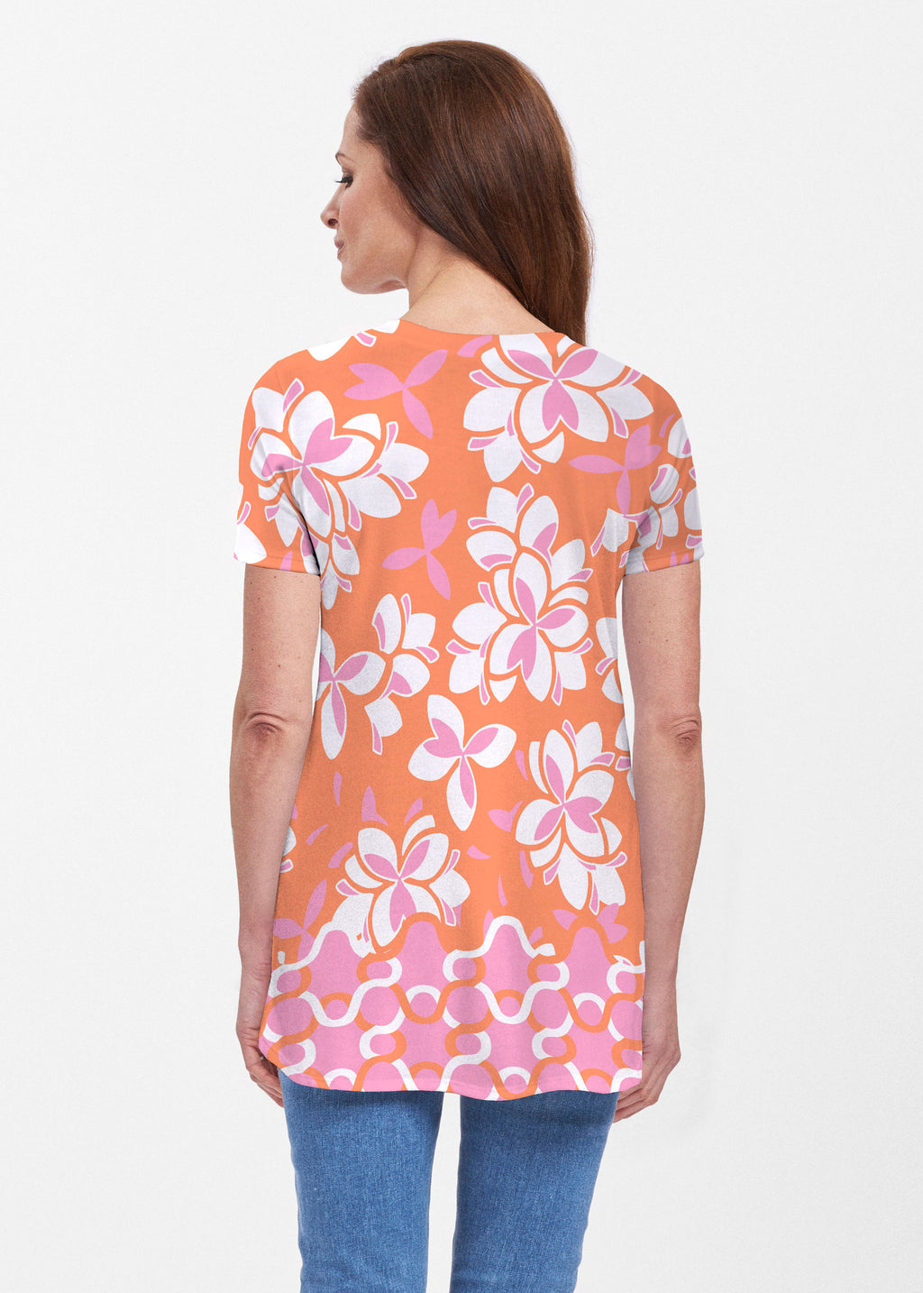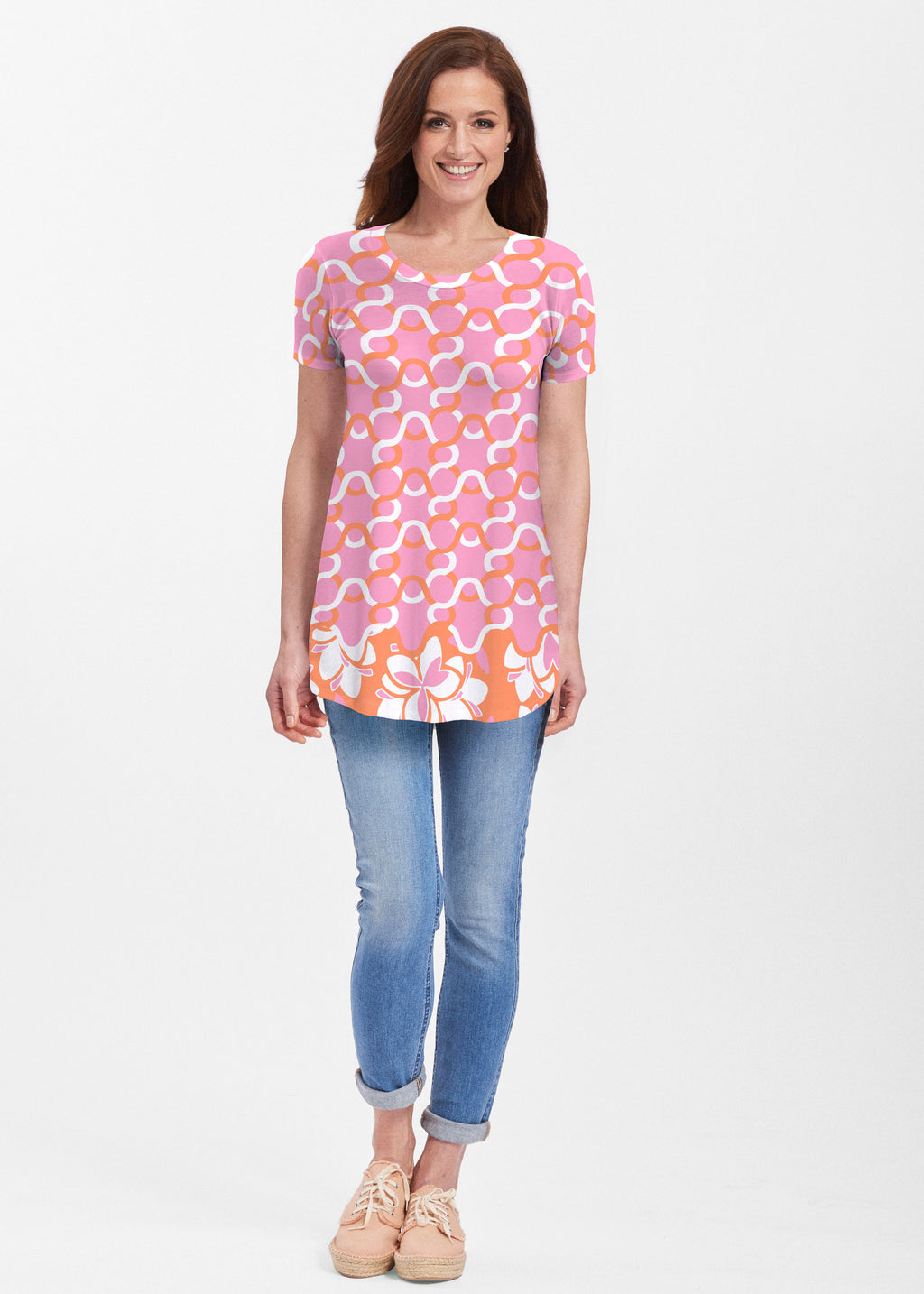 Our soft and feminine short sleeve silhouette tunic is sure to flatter any figure. Made in our Butterknit fabic that flows into a relaxed curved hem that is slightly longer in the back with subtle side slits.