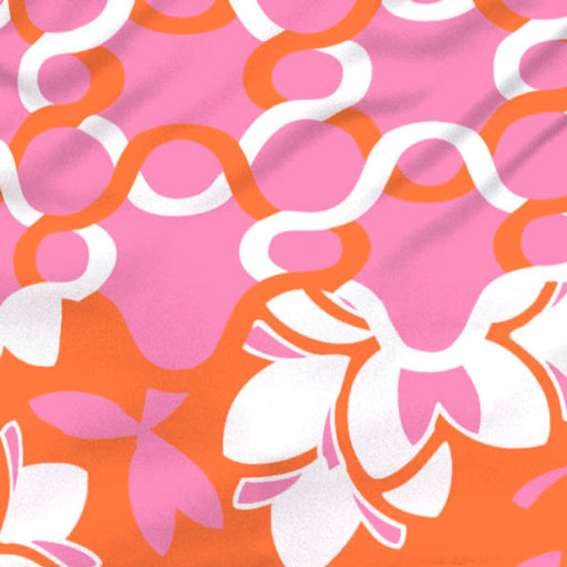 Cheerful bright orange, pink, white geometric print with contrasting front to back print with vivid florals designed by Alison Hoenes.