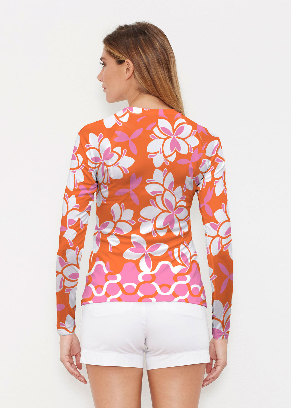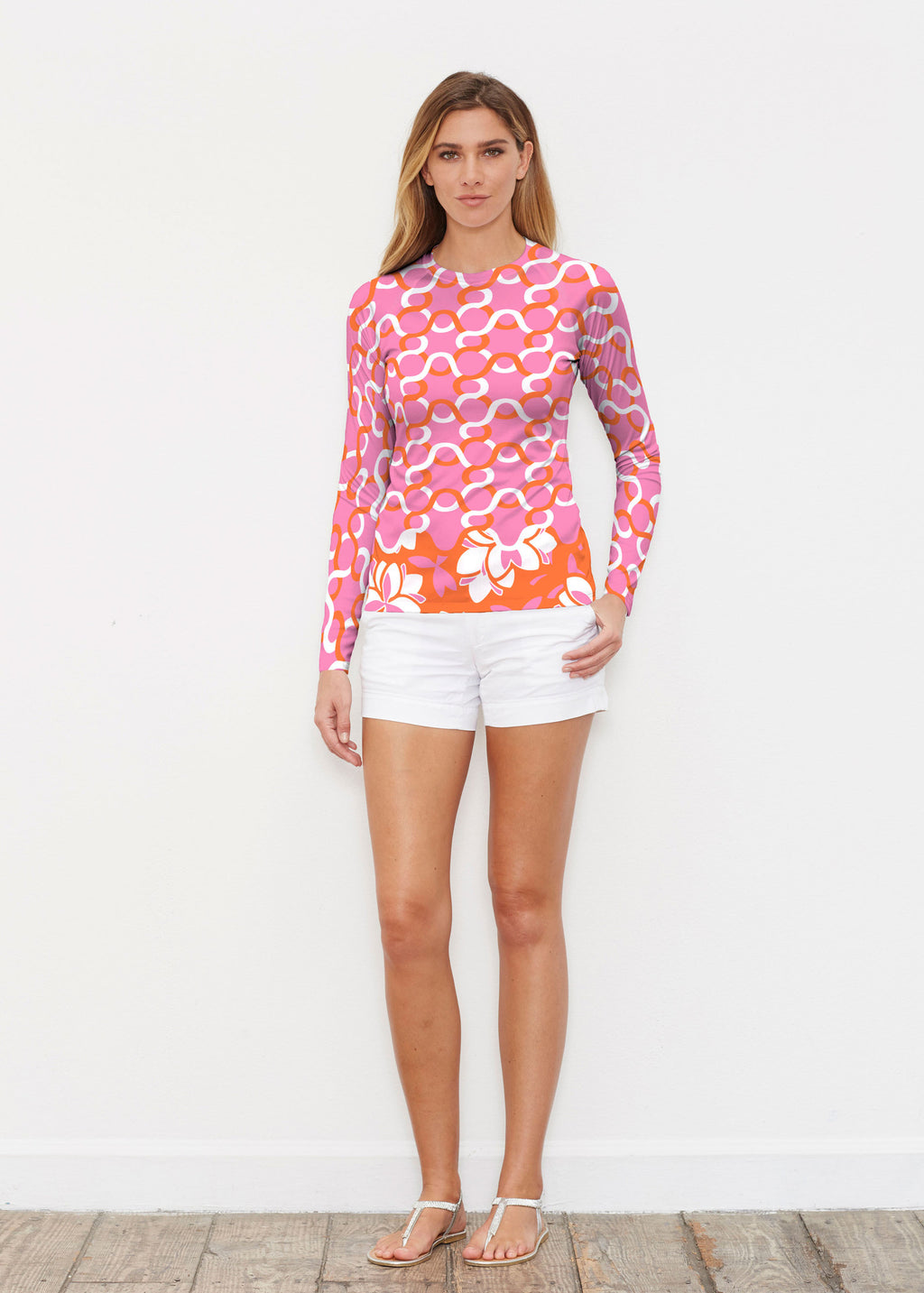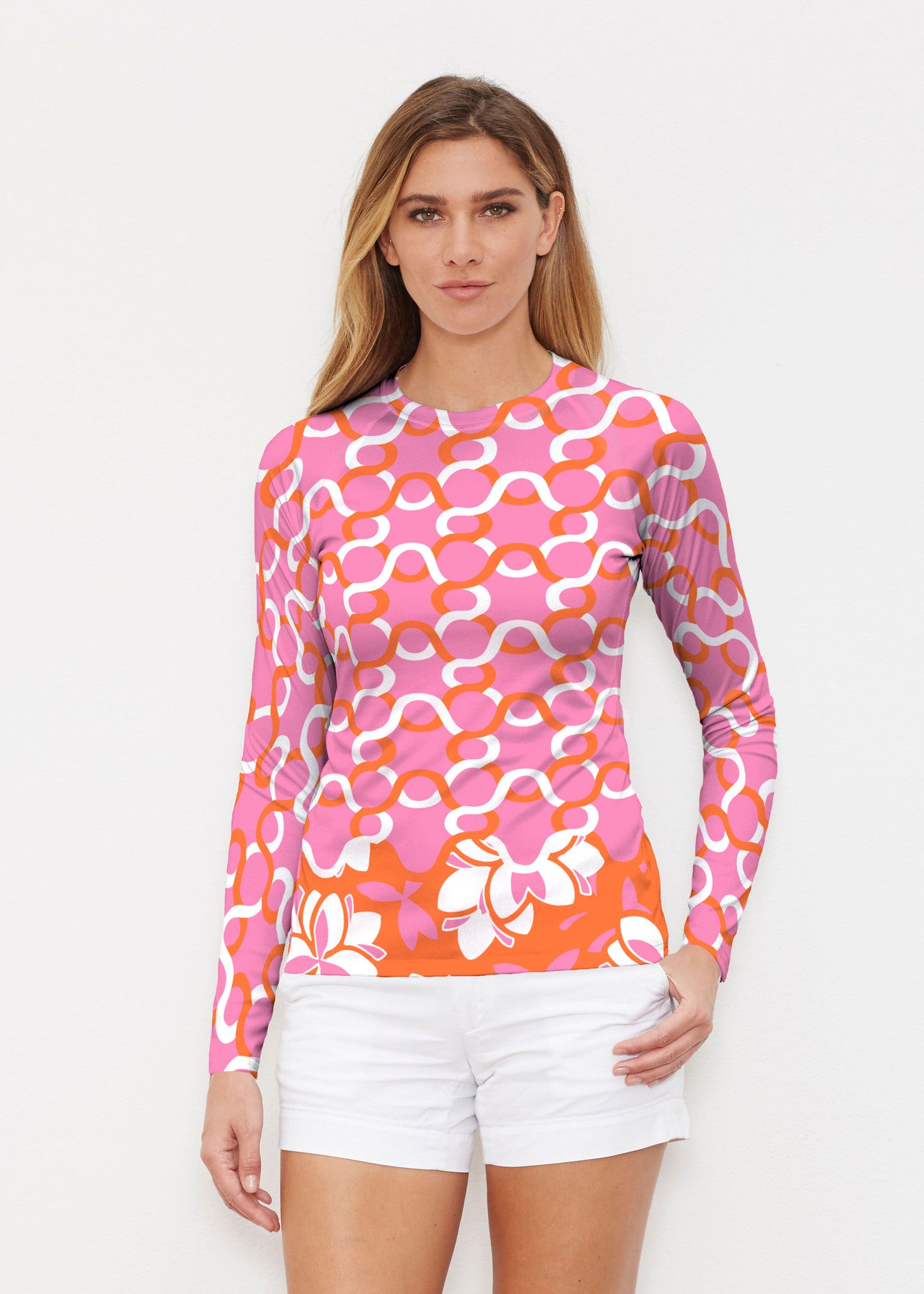 Our WHIMSY ROSE™ Safe Sun UPF 50+ long sleeve, crew neck rash guard offers versatile, beach-to-bistro style, supreme comfort, and an activewear fit. Made in a specially designed Safe Sun textile that blocks more harmful rays and provides a smart solution for those who love to swim, surf, kayak, canoe, waterski, boat, or simply relax waterside.
