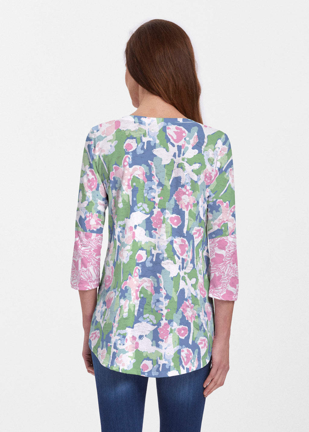 This v-neck tunic in our Signature burnout fabric is forever flattering. 3/4 sleeves and a v-neck flow into a full, swinging shirttail hem.