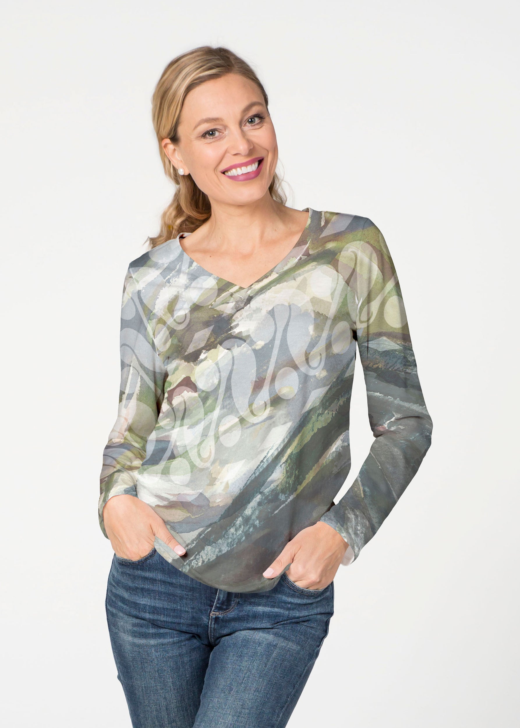 Our French Terry top is comfort and style all in one! Our French Terry top that features long sleeves, a V-neck and a more fitted silhouette that looks stylish in any print.