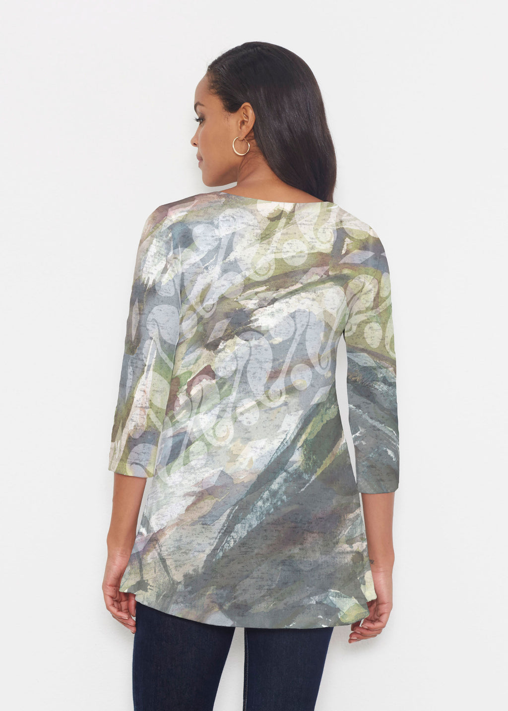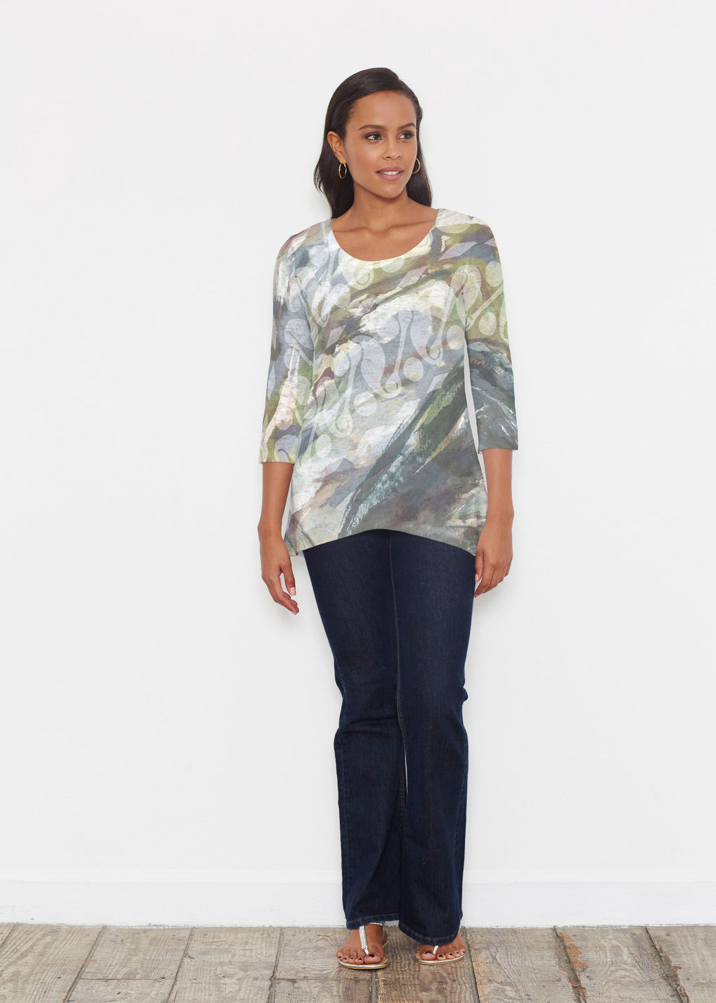 An elegant fit, the hemline falls higher in front then cascades beautifully down across back. Delicate scoop neckline and 3/4 sleeves made in our soft Baby Waffle burnout thermal blend.