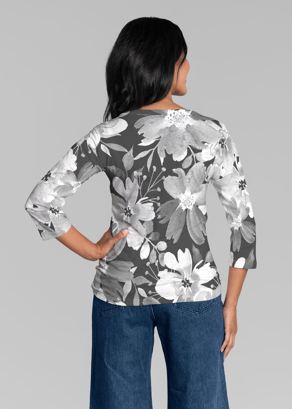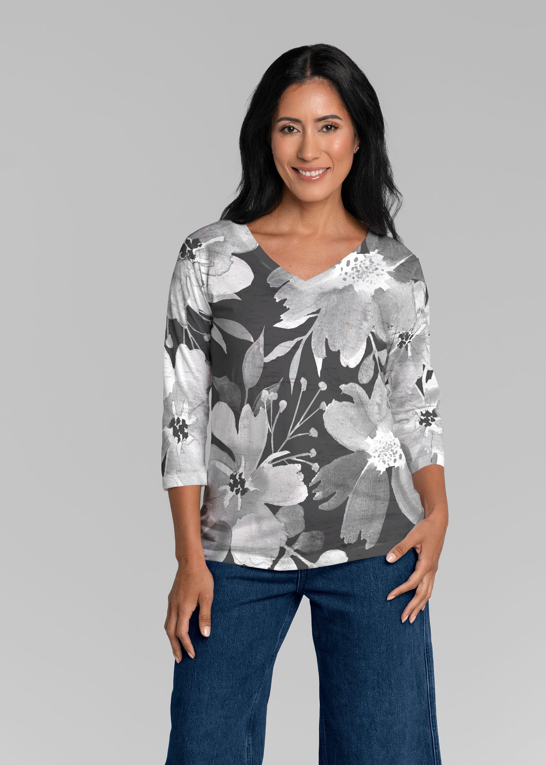 Festive Bloom Black (8174) ~ Signature 3/4 Sleeve V-Neck Top