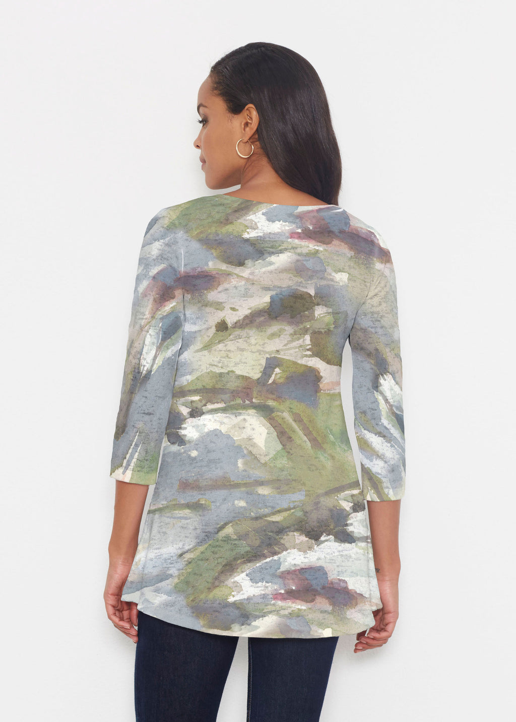 An elegant fit, the hemline falls higher in front then cascades beautifully down across back. Delicate scoop neckline and 3/4 sleeves made in our soft Baby Waffle burnout thermal blend.