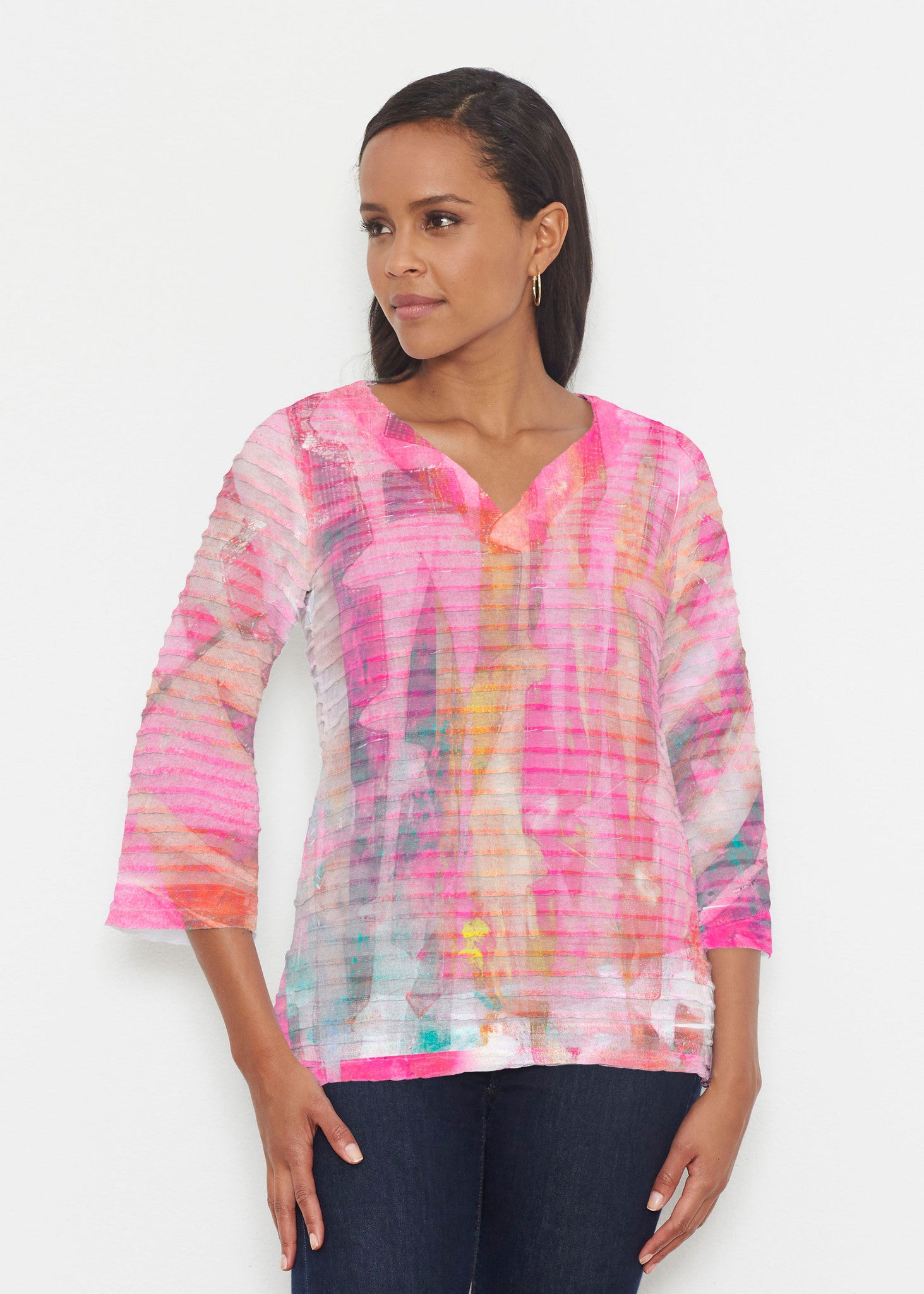 The uniquely soft, pleated texture in this Banded fabric give the 3/4 bell sleeves and sweetheart v-neck a fun and sophisticated look. Flattering side vents adorn the hemline that skims the hip.