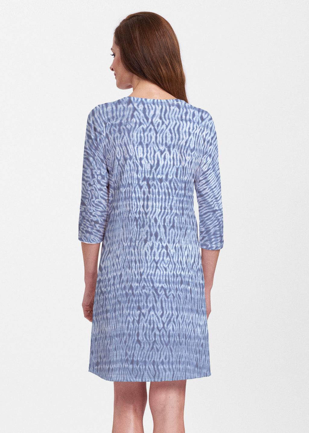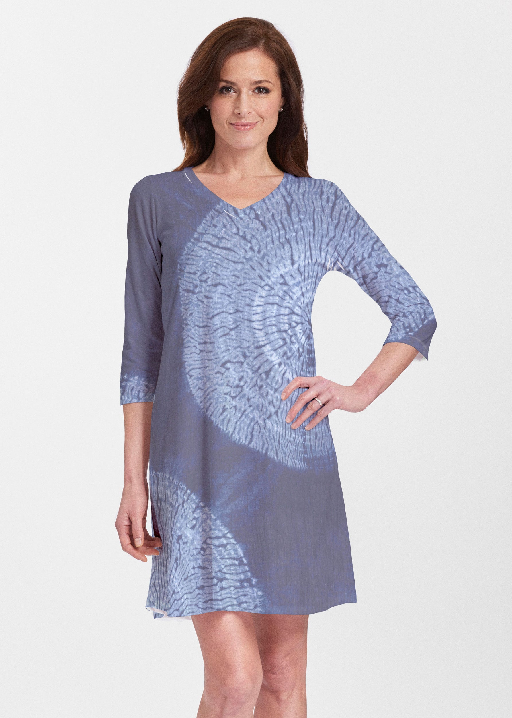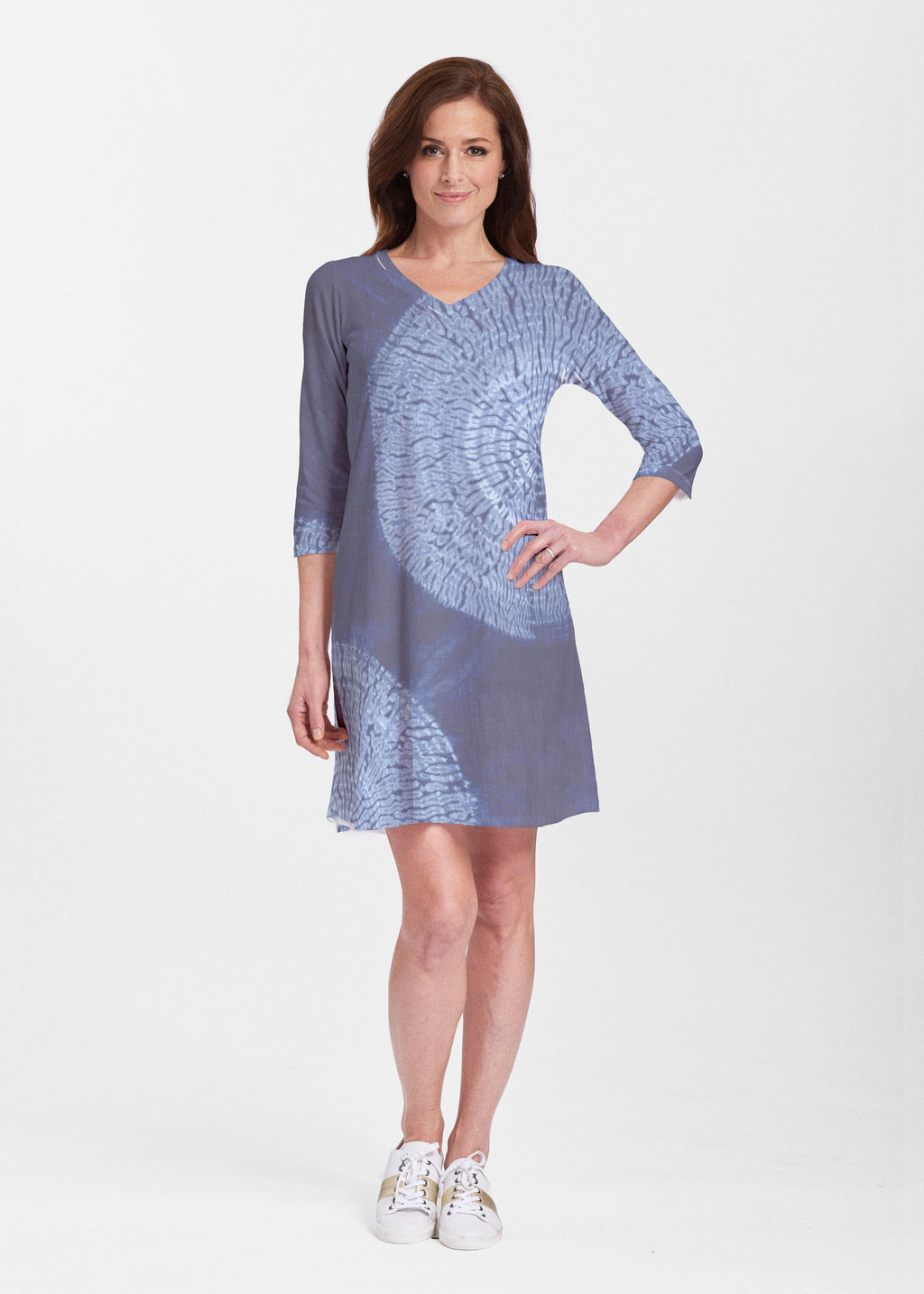 A relaxed swing silhouette with 3/4 sleeves and v-neck make up the newest addition to our Classic dress collection. Hem falls just above the knee.