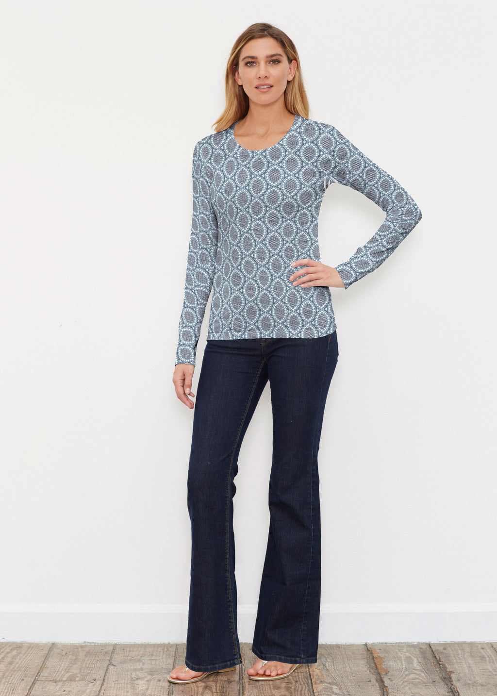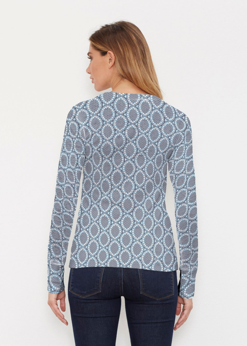 A fun subtle all over geometric print in blue and aqua, designed by Diane Kappa.
