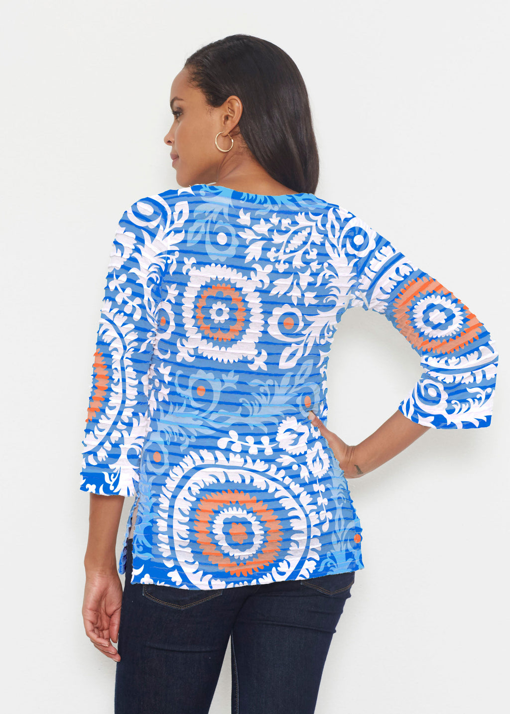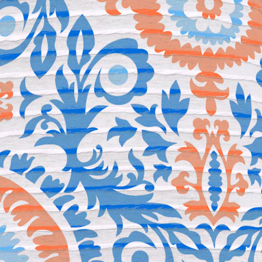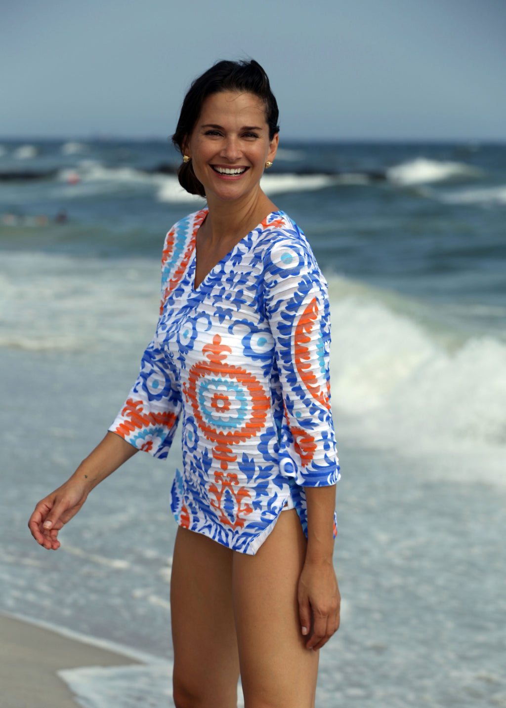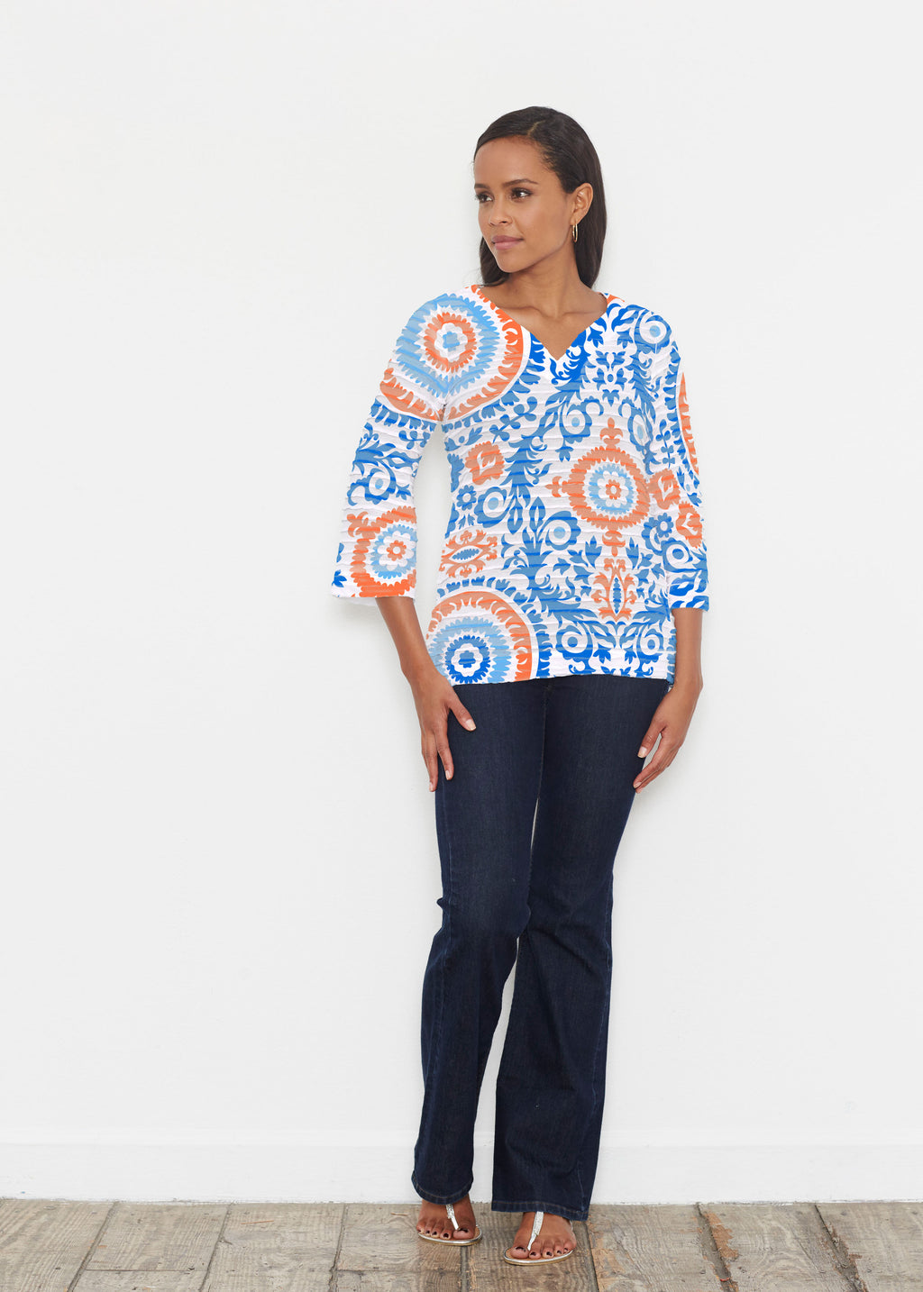 A playful mix of florals and geometric shapes in orange, aqua and navy with contrasting back to front color detail. Designed by Debra Valencia.